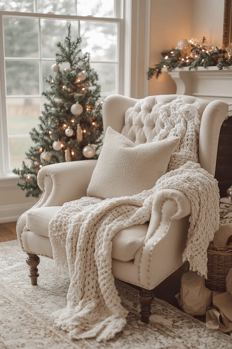 Design a cozy nook that inspires relaxation with Christmas decorating ideas centered around comfort. Add a soft chair, twinkling lights, and a warm throw blanket. Include a side table for cocoa and books. The ambiance feels peaceful and intimate. Curl up with your favorite read and let quiet holiday bliss surround you.