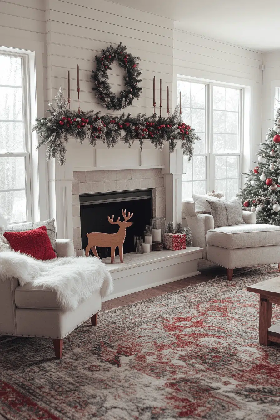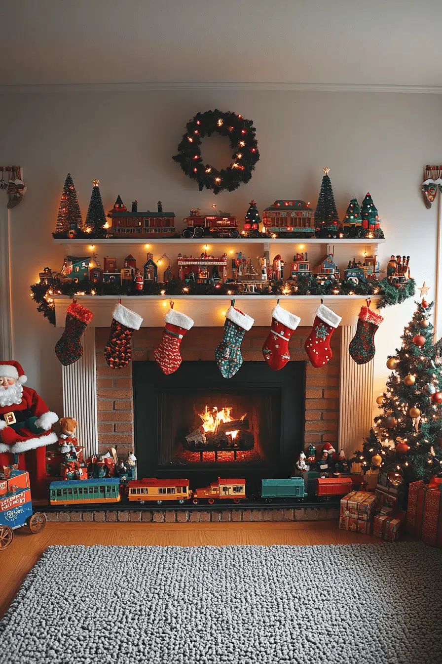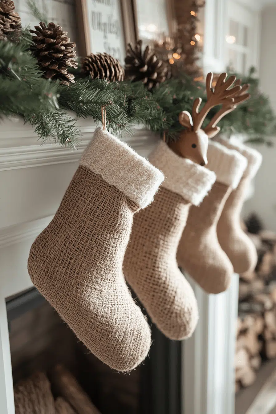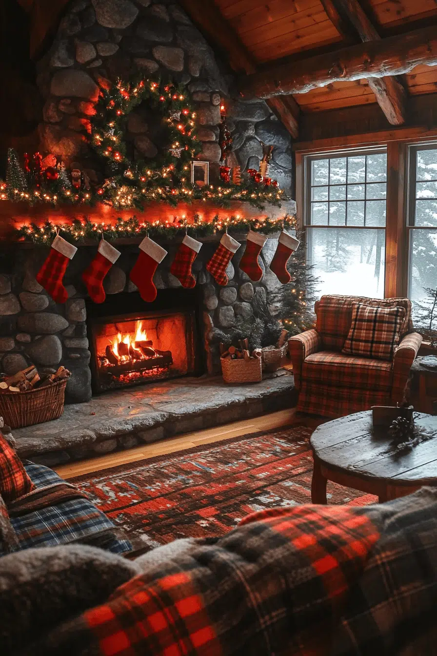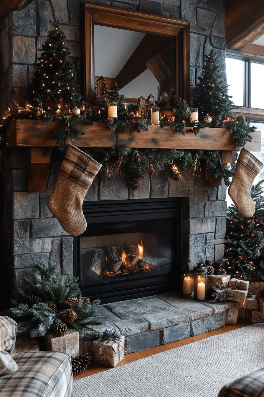Chunky knits, plaid stockings, and wood-burned details bring cozy cabin vibes to your Christmas mantel decor. The textures feel warm and tactile, perfect for fireside evenings. A mix of greenery and soft lighting completes the relaxed aesthetic. It’s rustic simplicity wrapped in comfort. Transform your mantel into a mountain-style hideaway and let winter coziness take over.