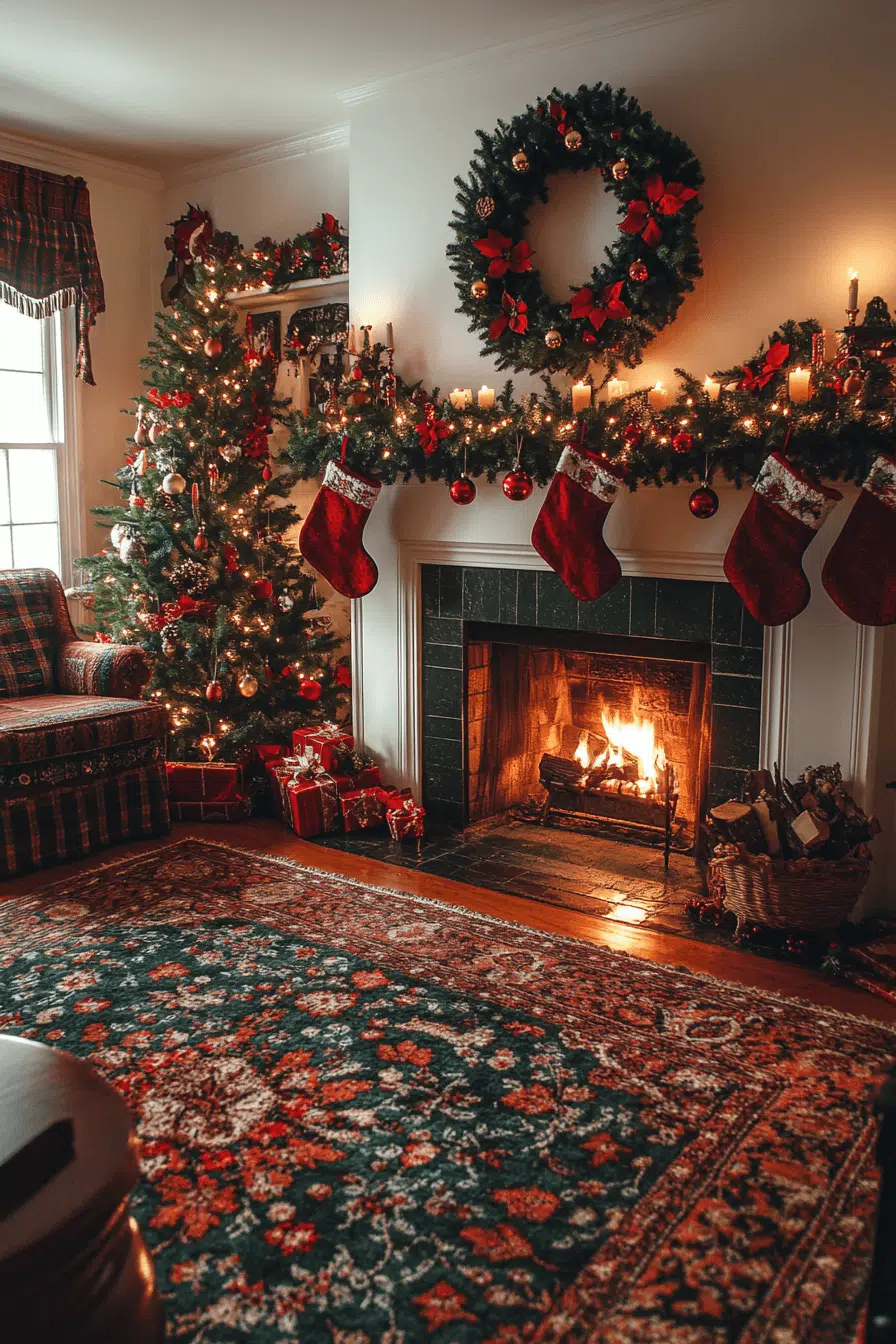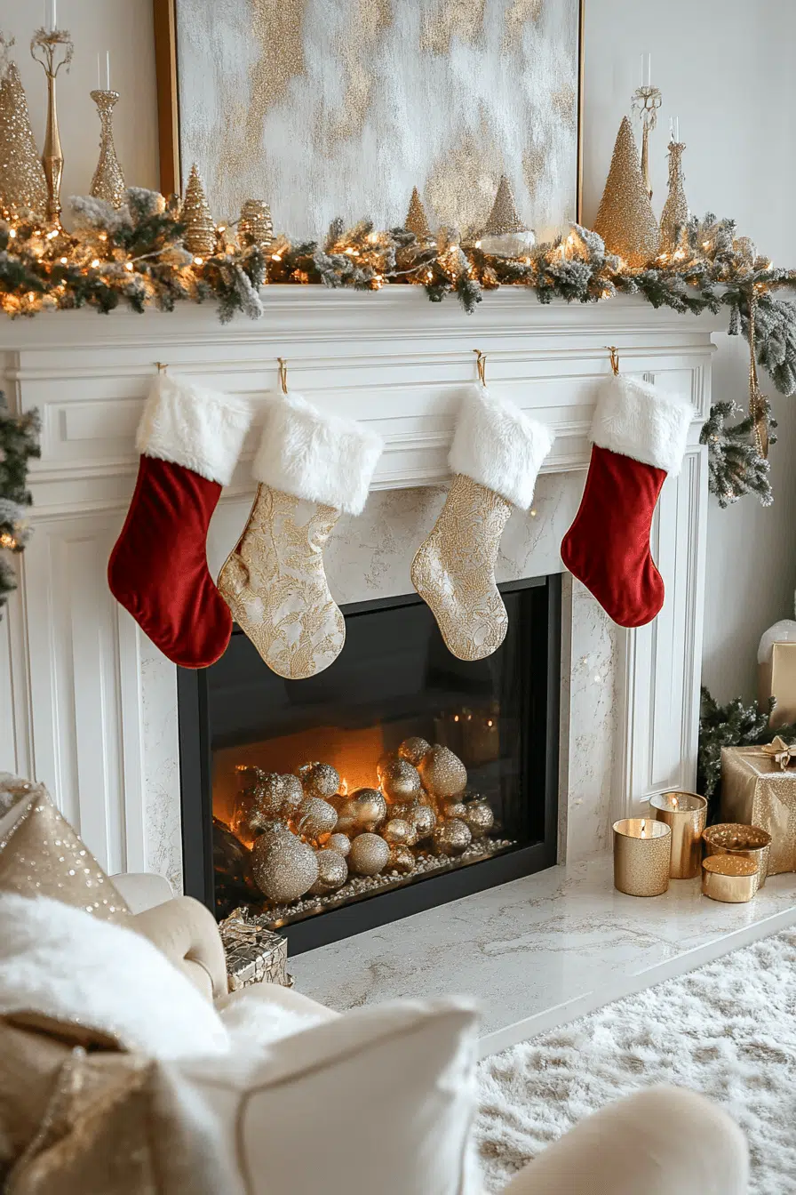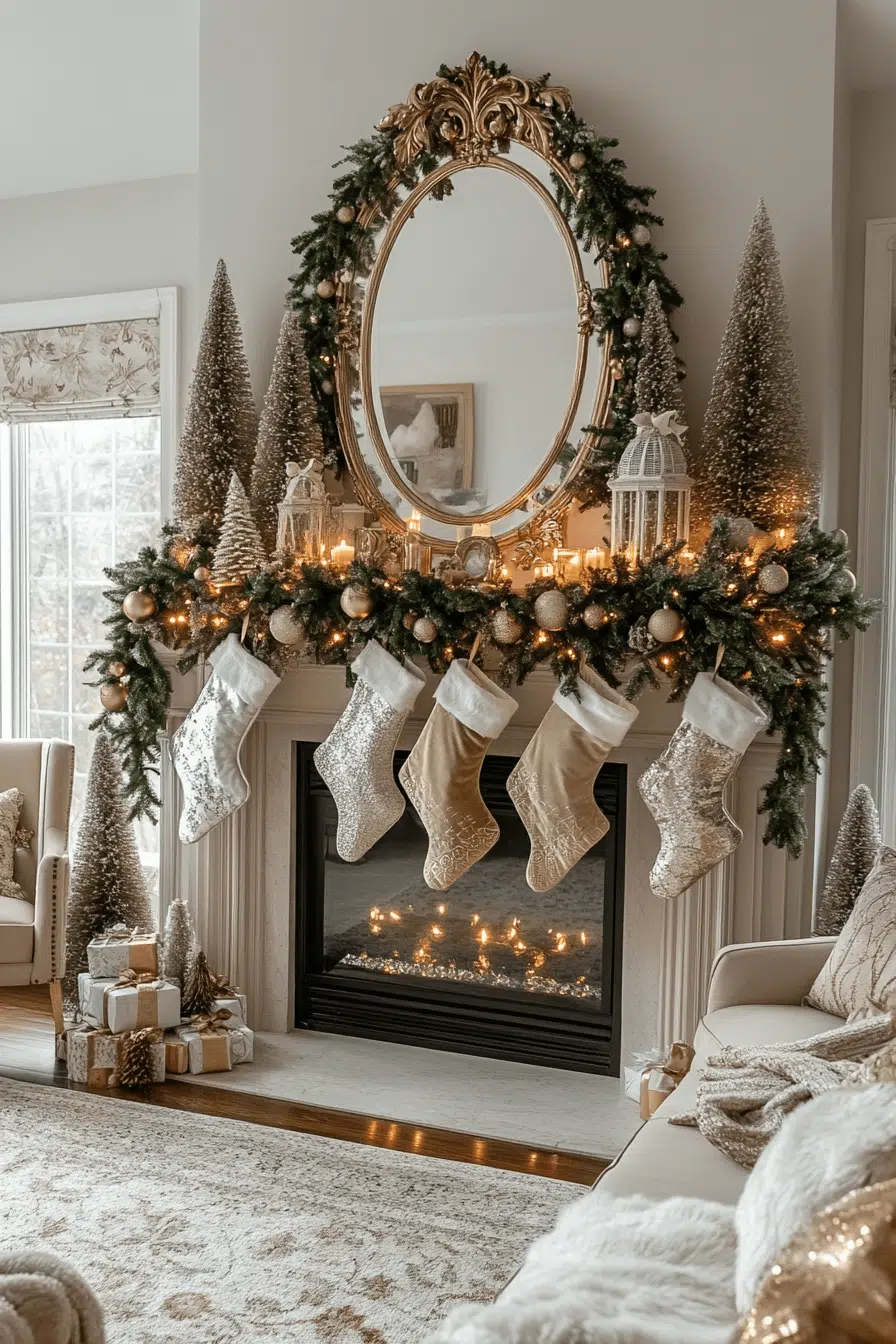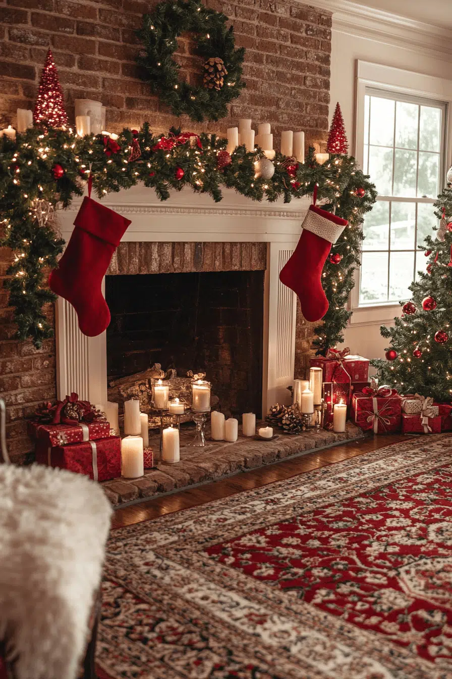 Deep reds, emerald greens, and gold accents create a Victorian-inspired Christmas mantel decor that feels rich and romantic. Lace-trimmed stockings and ornate candleholders add regal flair. The look is opulent yet welcoming. It’s holiday grandeur with heart. Step back in time and let your mantel exude vintage sophistication.