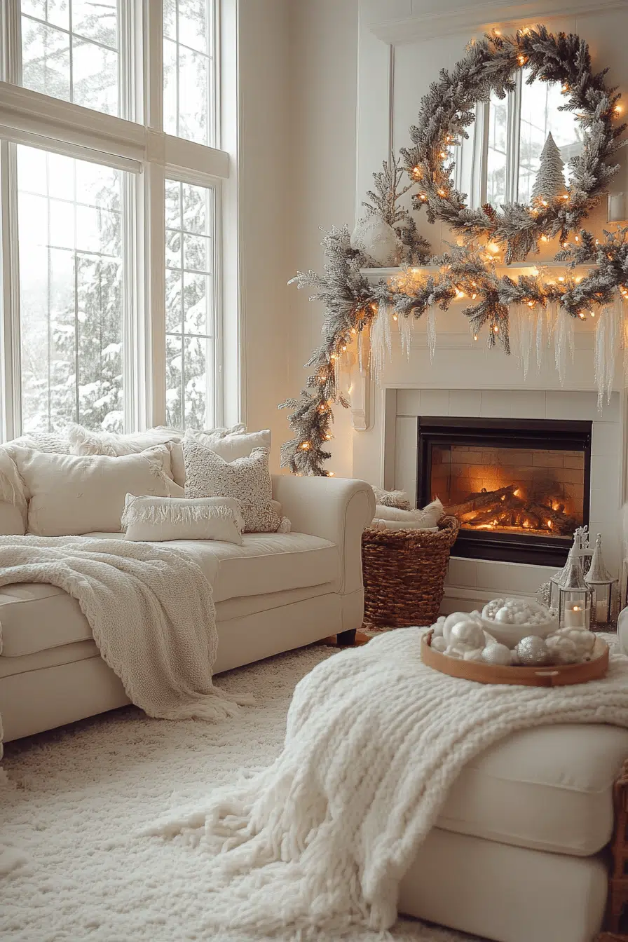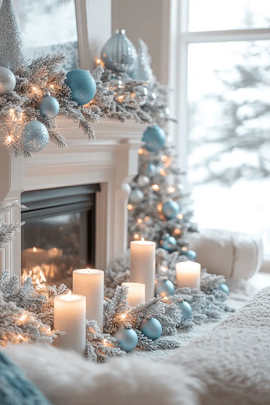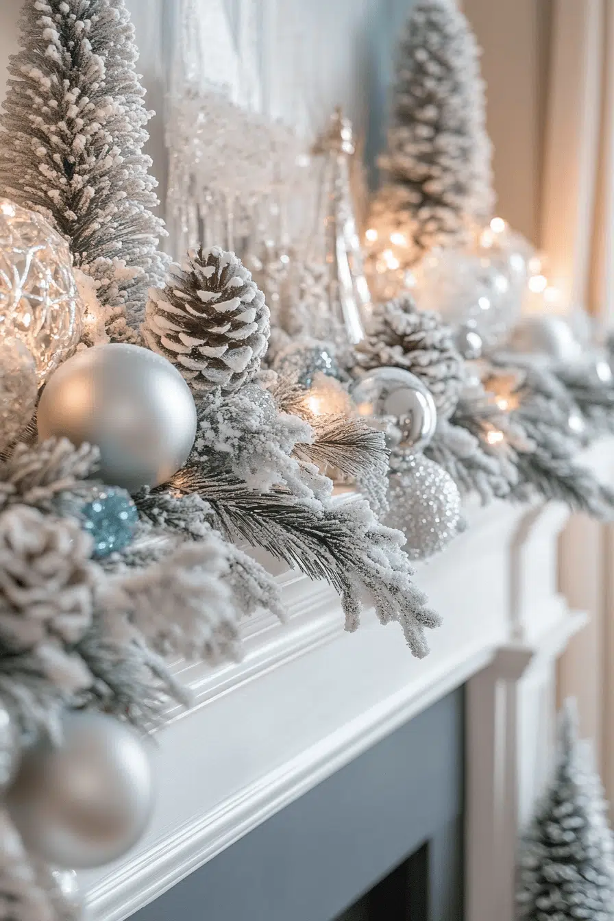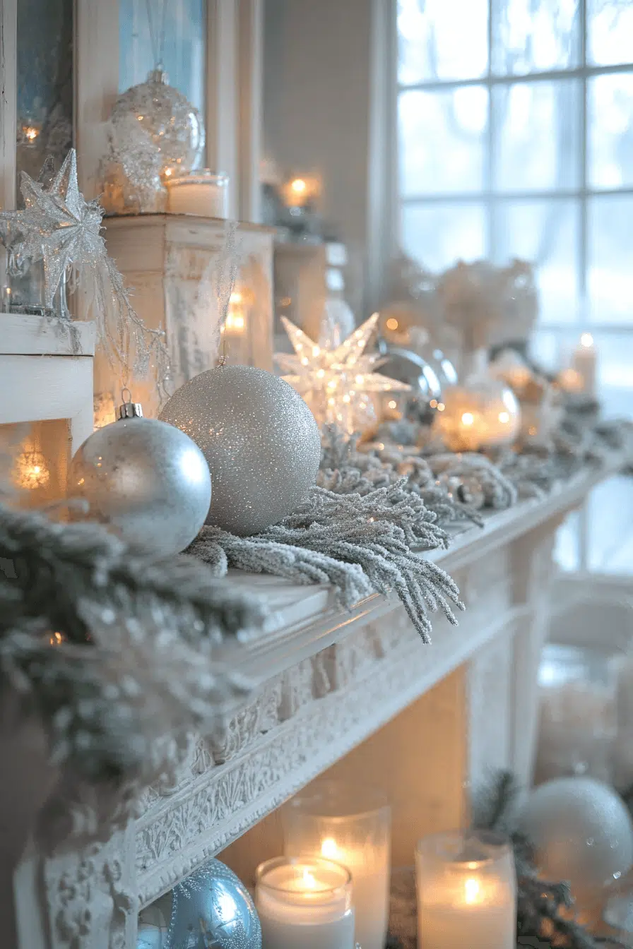 Soft whites, silvery tones, and icy blue accents transform your home into a peaceful snow-kissed retreat. This Christmas mantel decor sparkles with delicate light, bringing the calm of winter indoors. Frosted greenery and crystal ornaments add just the right touch of shimmer. The result is soothing, elegant, and full of wonder. Create your own snow-covered sanctuary and let your mantel sparkle with serenity.