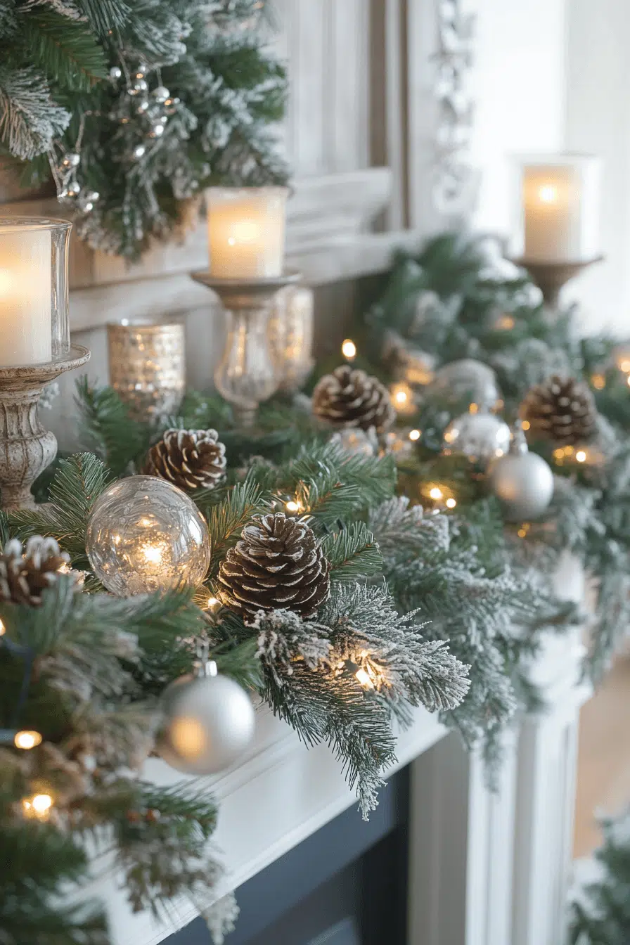 Frost-dusted greenery, silvery ornaments, and glass candles create a peaceful, snowy glow in this elegant Christmas mantel decor. The look is bright yet calm, sparkling yet soft. Every shimmer feels like winter captured indoors. It’s quiet luxury made festive. Bring frosted beauty into your home and let your mantel shimmer with gentle radiance.