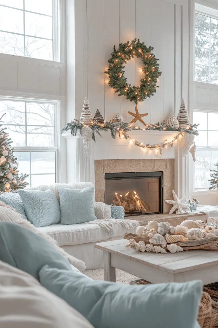 Sea-glass tones, driftwood, and delicate ornaments bring breezy sophistication to coastal-style Christmas mantel decor. It’s festive yet tranquil, evoking waves and winter skies. Starfish and shells add playful charm to the display. The atmosphere feels calm, airy, and bright. Invite ocean serenity inside and let your mantel shimmer with seaside spirit.