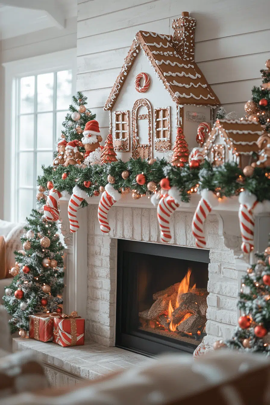 Candy-striped stockings, gingerbread figurines, and faux frosting details make this Christmas mantel decor sweetly nostalgic. Each piece looks like it belongs in a holiday bakery window. The design feels playful, warm, and full of heart. It’s pure festive joy in every detail. Add a sprinkle of sweetness and make your mantel look good enough to eat.