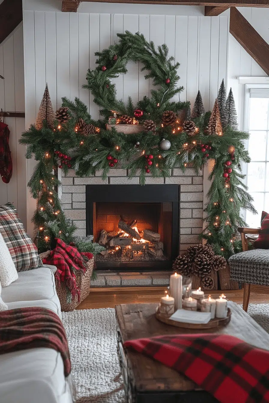 Warm wood textures, glowing garlands, and gentle candlelight make this Christmas mantel decor radiate comfort and charm. The earthy palette feels timeless, inviting everyone to linger near the fire. Subtle plaid ribbons add nostalgic warmth without overpowering the space. Every flicker of light creates a feeling of home. Infuse your mantel with rustic beauty and let it glow with authentic holiday warmth.