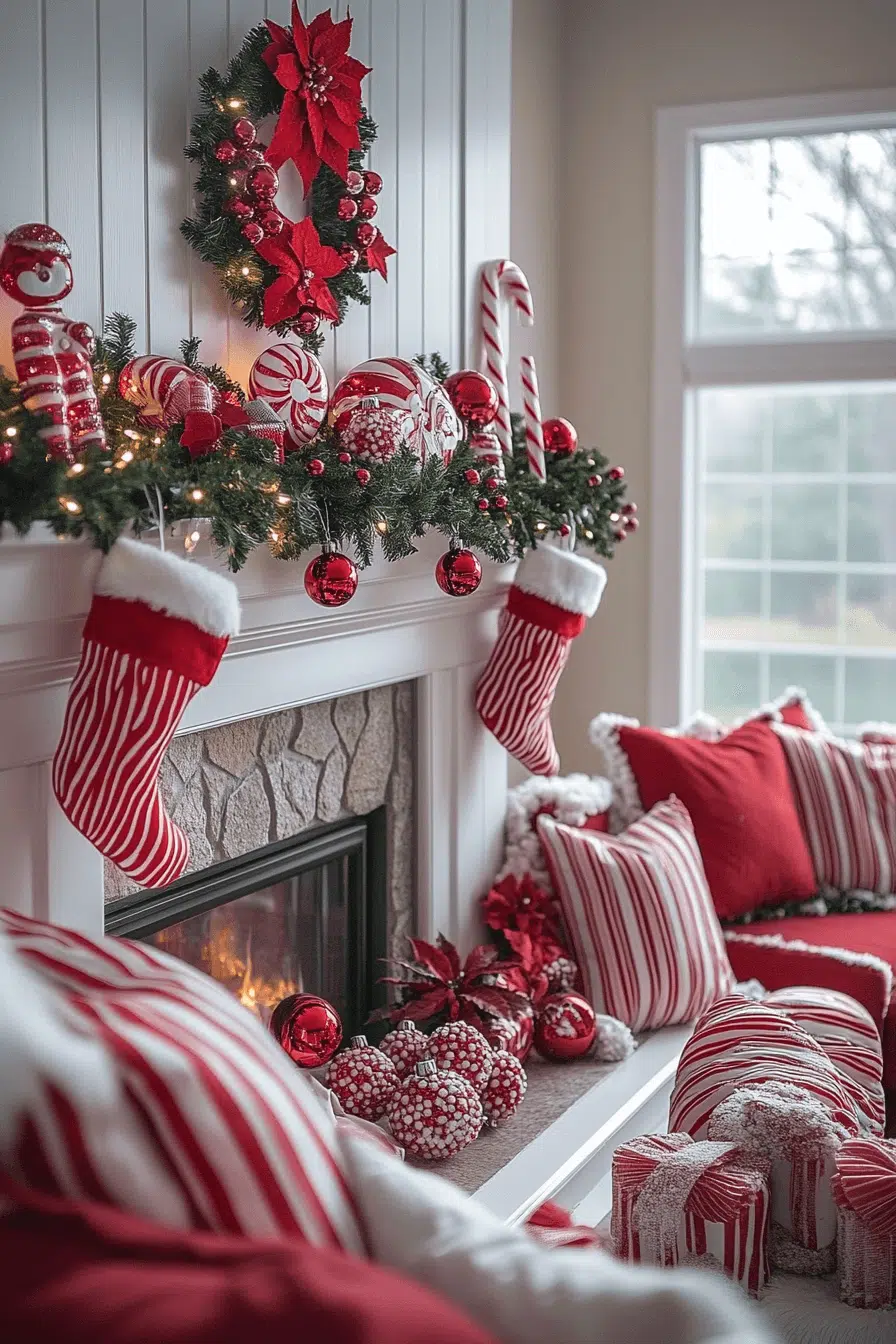 Red and white stripes, playful ornaments, and nostalgic toys fill your home with happiness through this cheerful Christmas mantel decor. The colors burst with youthful joy and festive nostalgia. Each piece sparks smiles and laughter. It’s holiday cheer at its most delightful. Bring back childlike wonder and let your mantel radiate pure happiness.