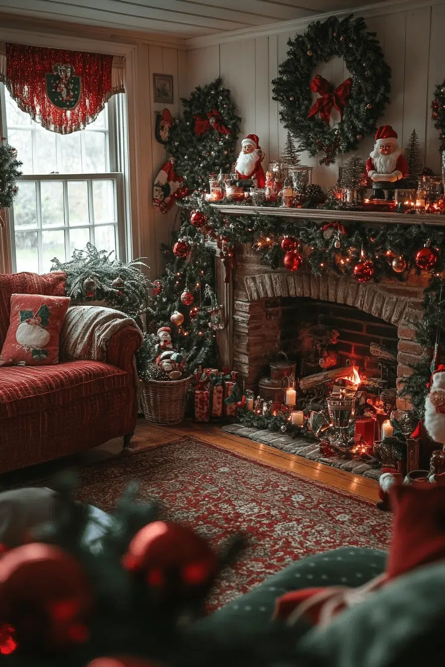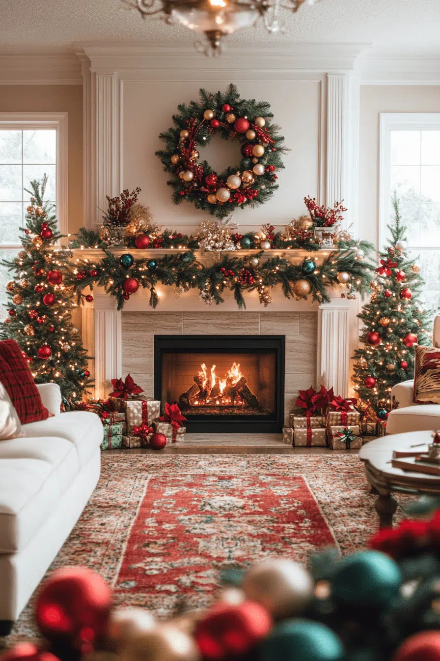 Classic red and green accents bring timeless beauty to this nostalgic Christmas mantel decor. Vintage ornaments, twinkling lights, and handmade details capture the heart of holiday tradition. The look feels joyful and full of comforting familiarity. Every sparkle tells a story of cherished memories. Bring the magic of tradition home and let your mantel celebrate Christmas past and present.