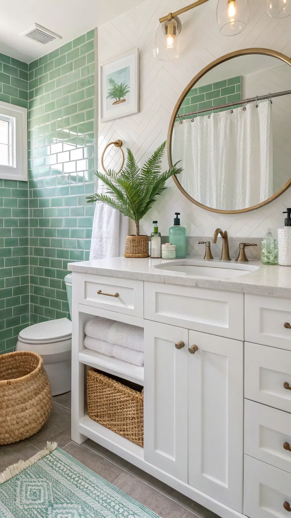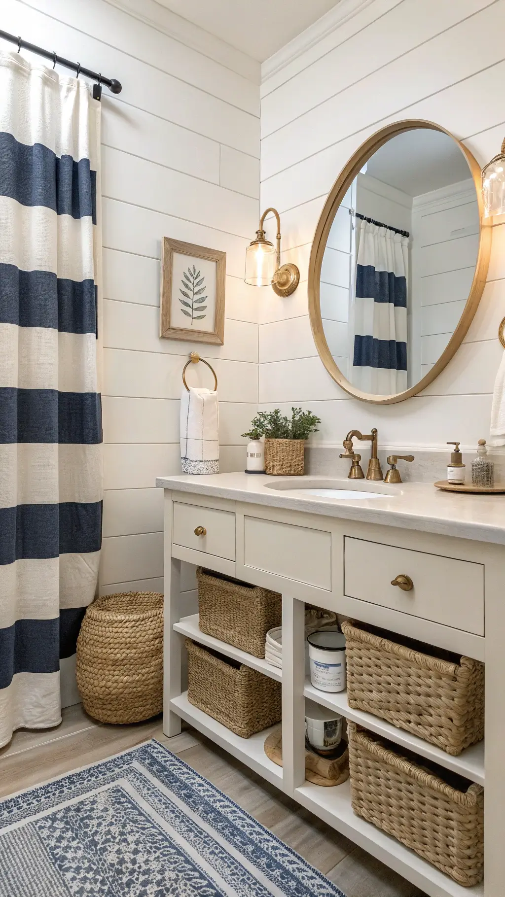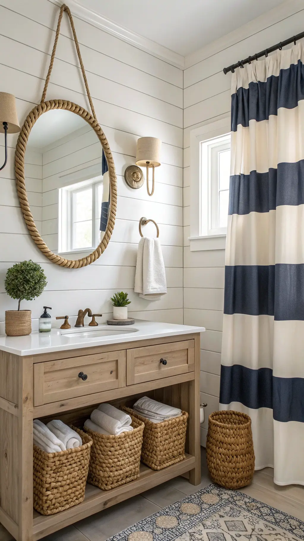 Swap in brighter towels and sea glass decor for summer, and driftwood and cozy textures for fall/winter.