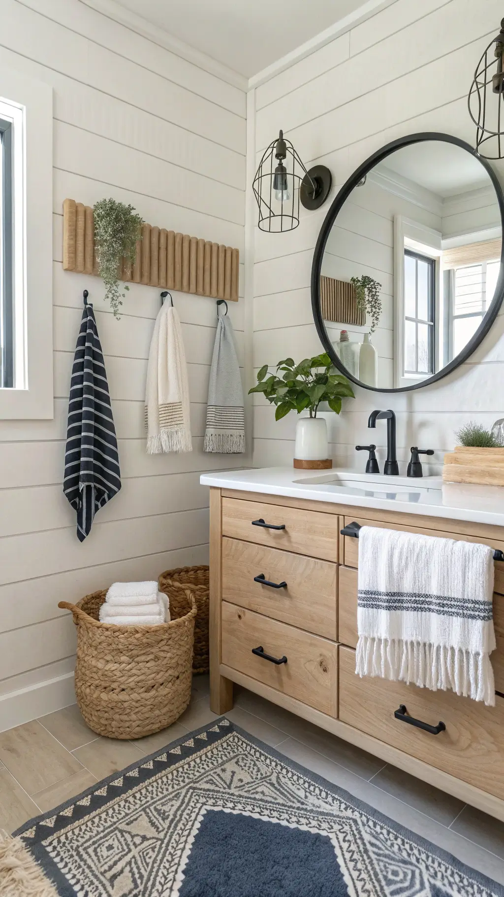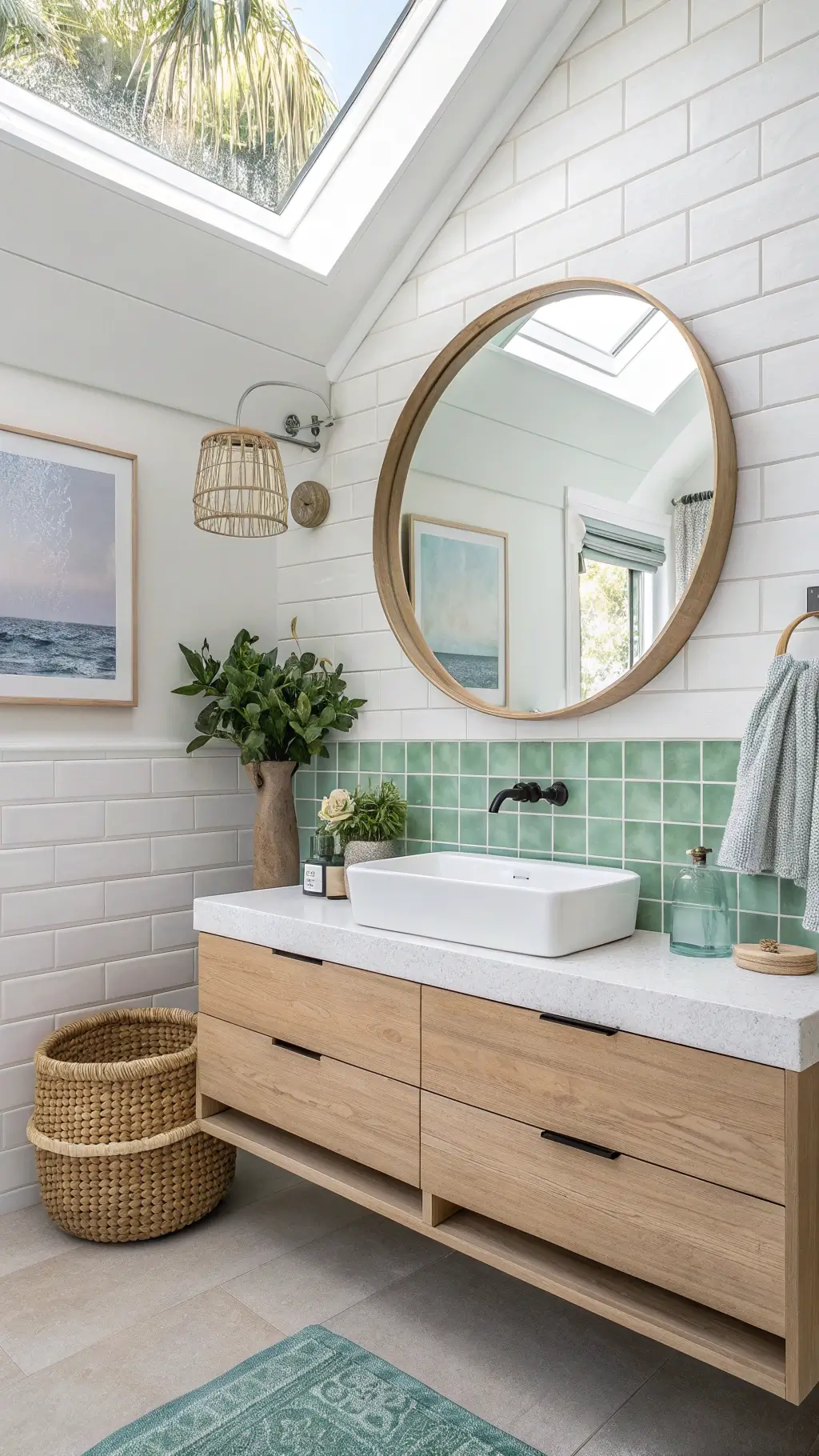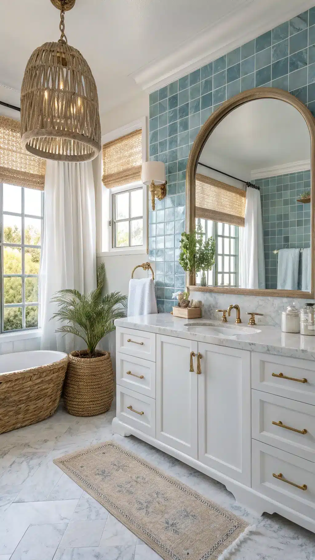 • Materials: Light oak or white-washed wood, rattan, jute, linen, stone, ceramic tile, and glass