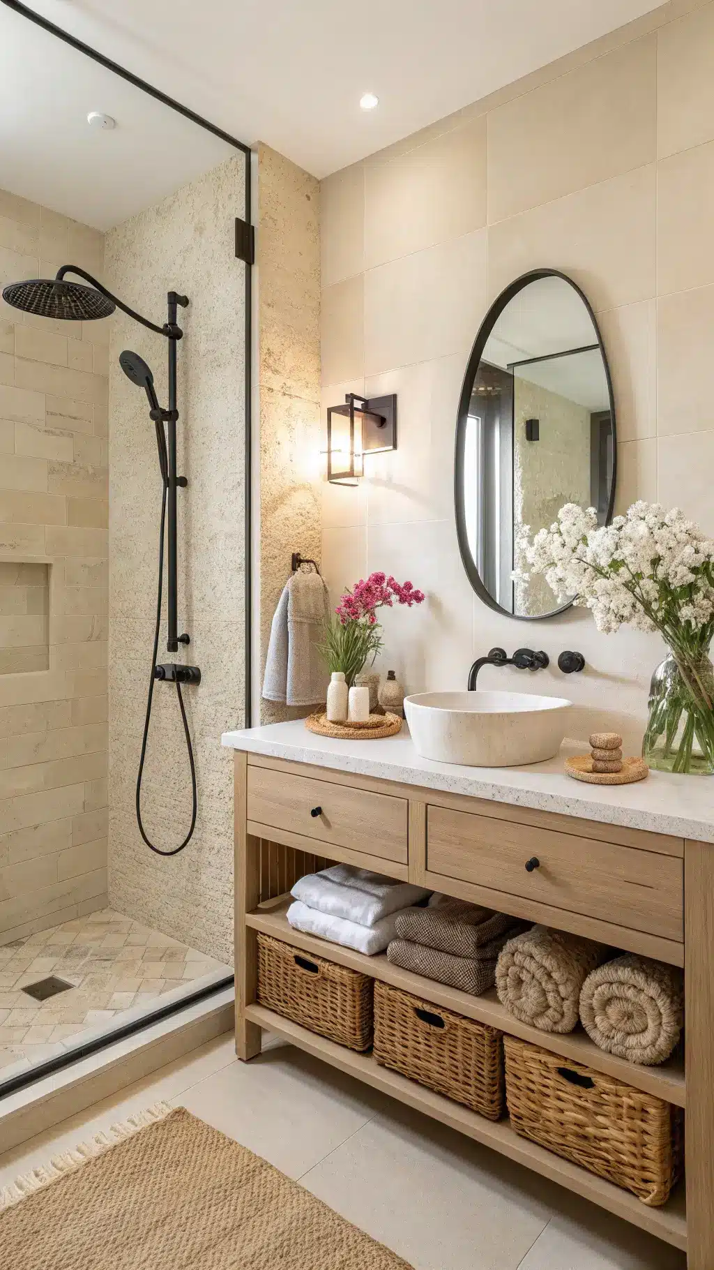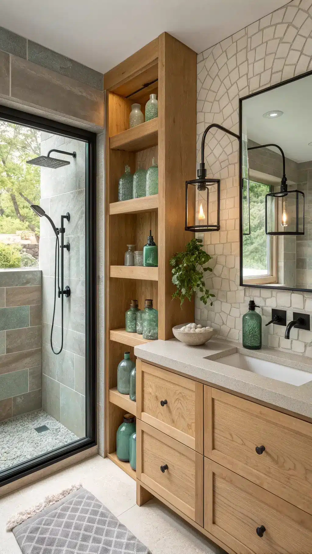 Your vanity does heavy lifting—storage, style, and function all at once. I went with a natural wood vanity with plenty of drawer space because cluttered counters destroy the peaceful vibe faster than anything else.