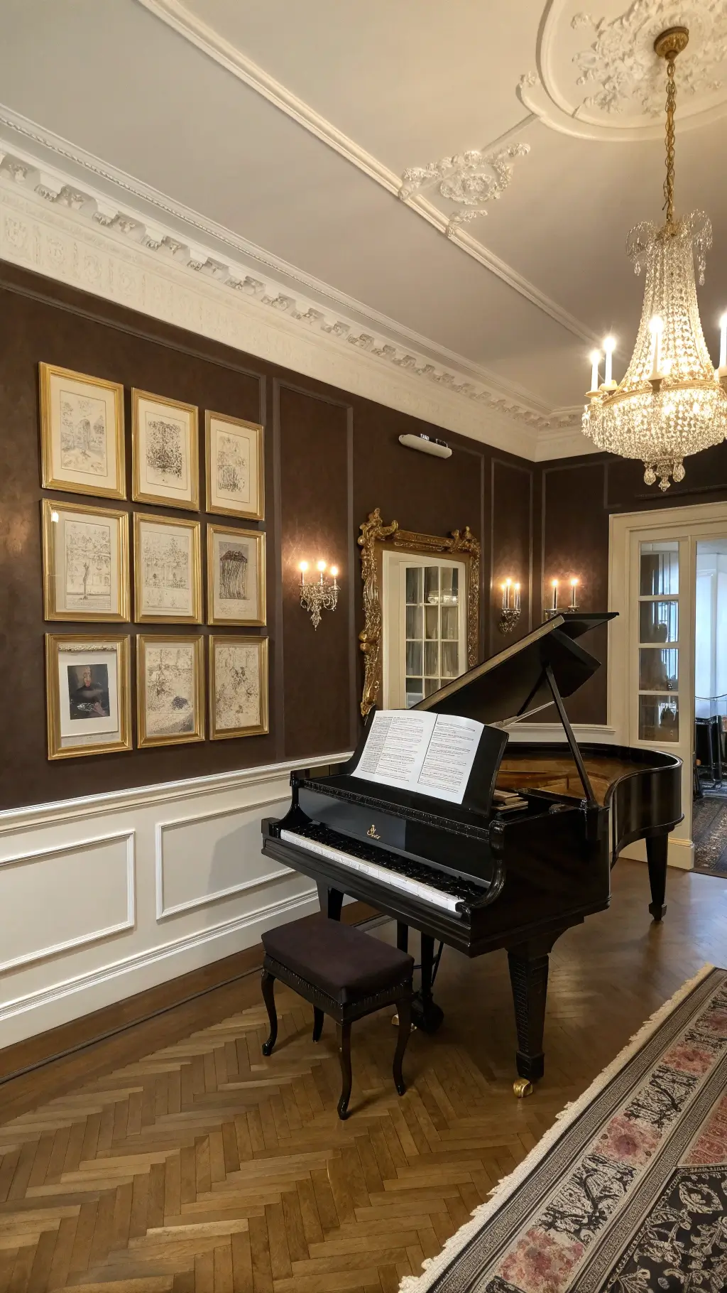 - Accent Colors: Gold, brass, deep bronze