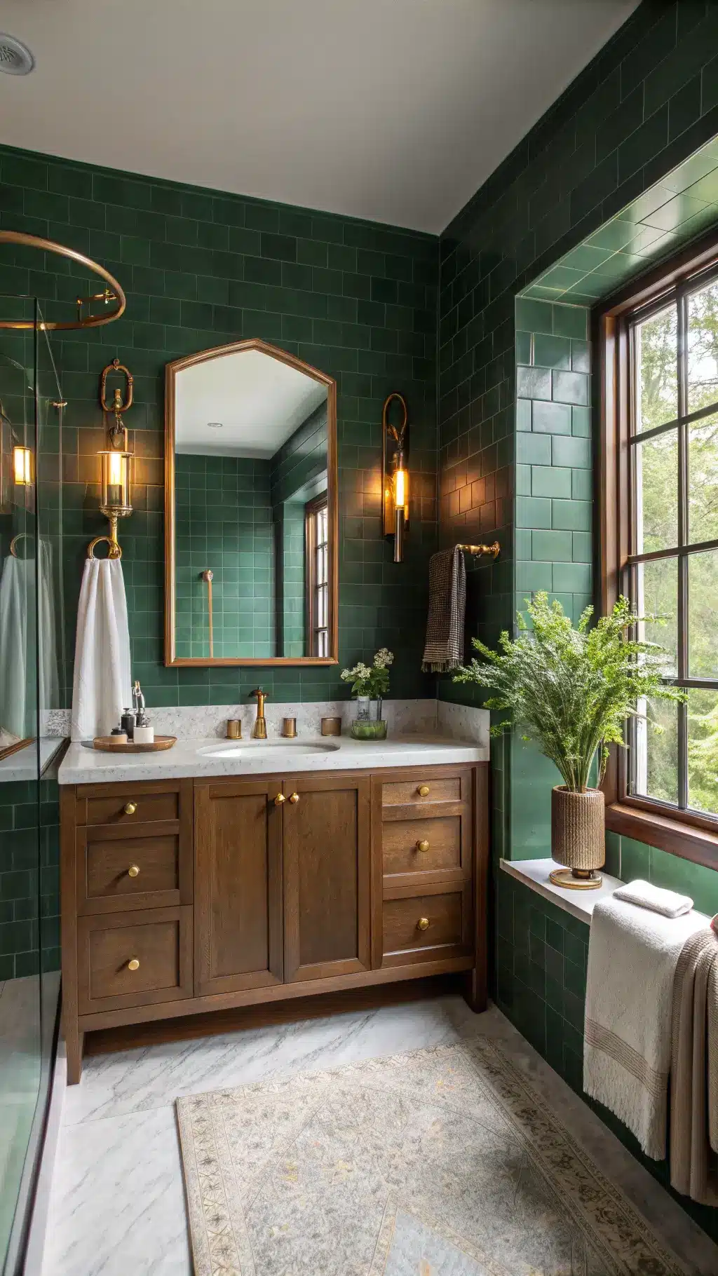 The best part about going dark green in your bathroom is that bathrooms are usually smaller spaces. That means you can be super bold with color without it feeling like too much. What might feel overwhelming in a living room becomes dramatic and intimate in a bathroom. It’s like wrapping yourself in a cozy, luxurious blanket every time you brush your teeth.