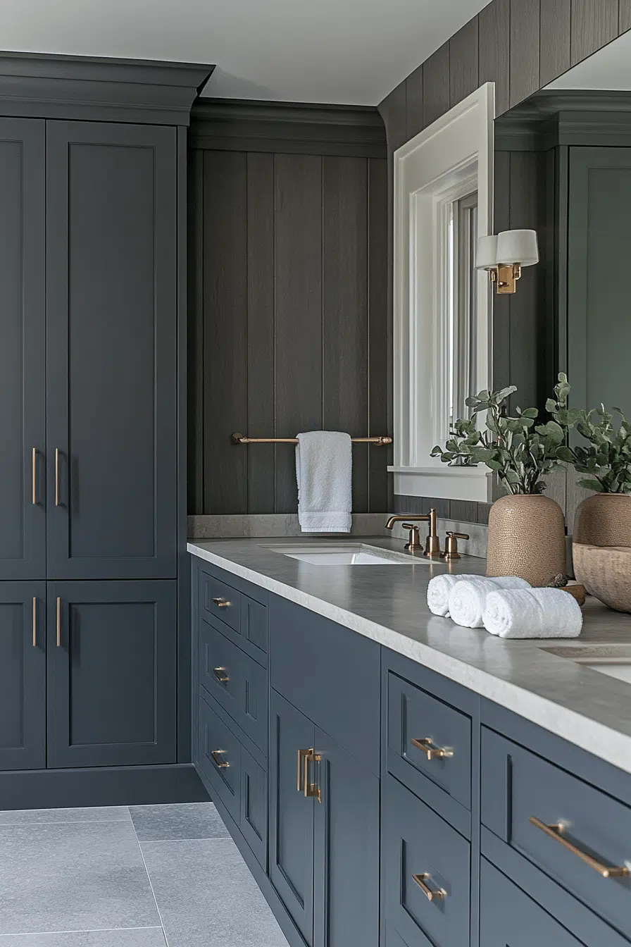 Graphite finishes create a smooth, modern aesthetic in a dark grey bathroom with bold simplicity. Matte surfaces unify the design. Minimal hardware keeps everything clean. Sculptural details add interest. The space feels sleek and calming. Reimagine your dark grey bathroom with graphite style!