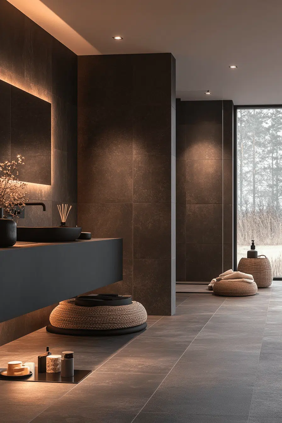 Natural textures create warmth and depth in a dark grey bathroom that feels grounded and organic. Stone and concrete elements add visual richness. Wood accents soften the darker palette. Soft lighting enhances the inviting atmosphere. The space feels balanced and calming. Bring natural beauty into your dark grey bathroom today!