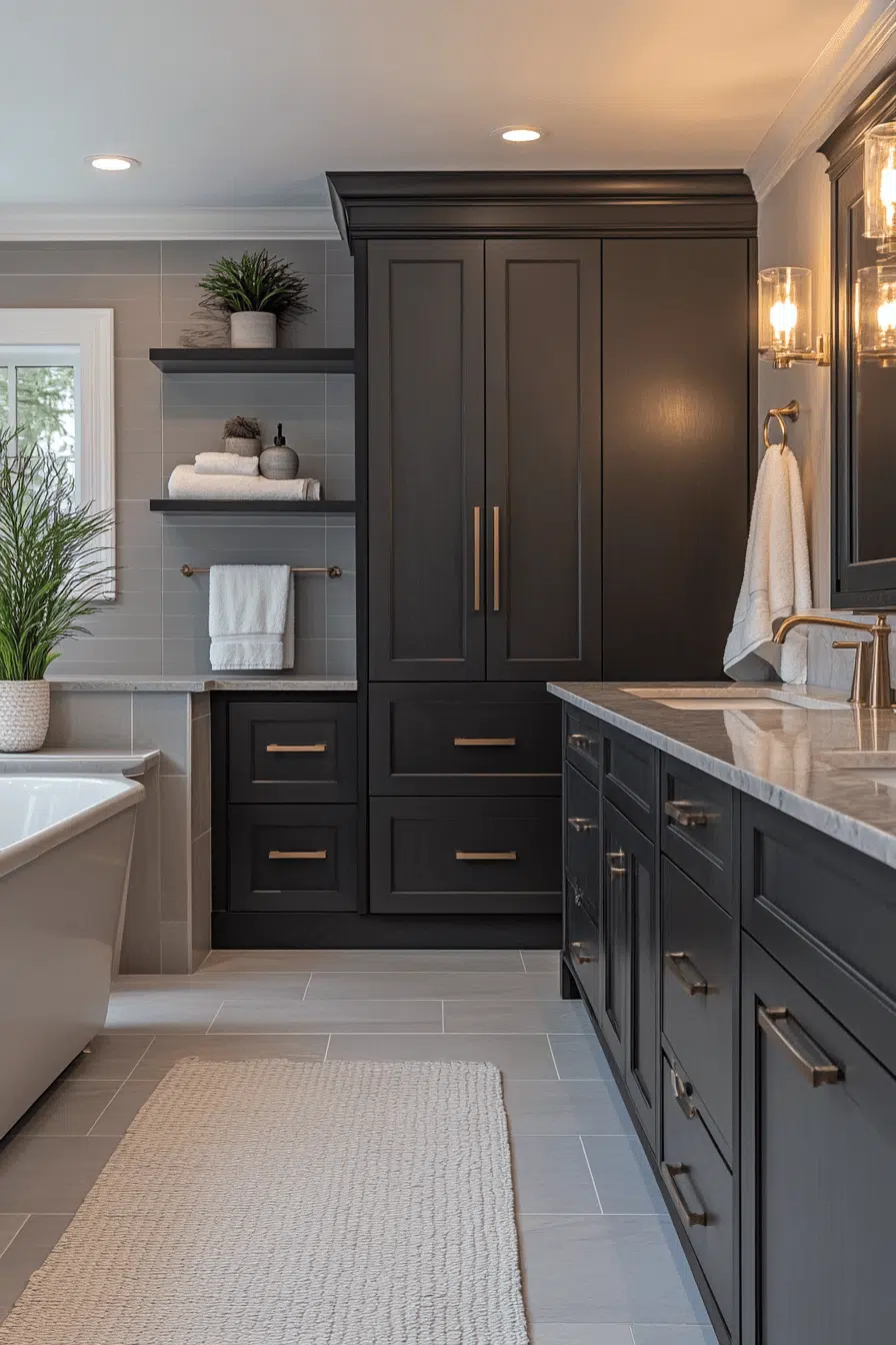 Charcoal elegance defines a luxurious dark grey bathroom that blends comfort with modern sophistication. Matte finishes and metallic accents add subtle contrast. Soft lighting enhances every surface beautifully. A soaking tub becomes the centerpiece of relaxation. The entire space feels intentional and upscale. Indulge in this refined dark grey bathroom upgrade today!