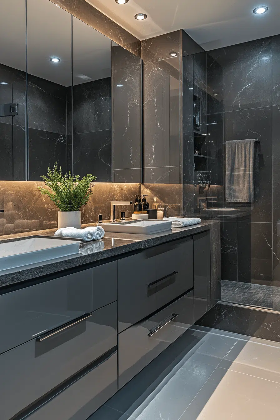 Shimmering finishes bring light and energy into a dark grey bathroom while maintaining its moody elegance. Glossy surfaces reflect light beautifully. Matte details add contrast and depth. Large mirrors enhance the sense of space. The design feels luminous and refined. Brighten your dark grey bathroom with this radiant approach!