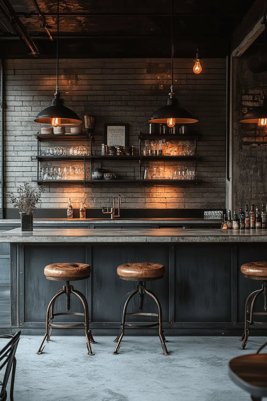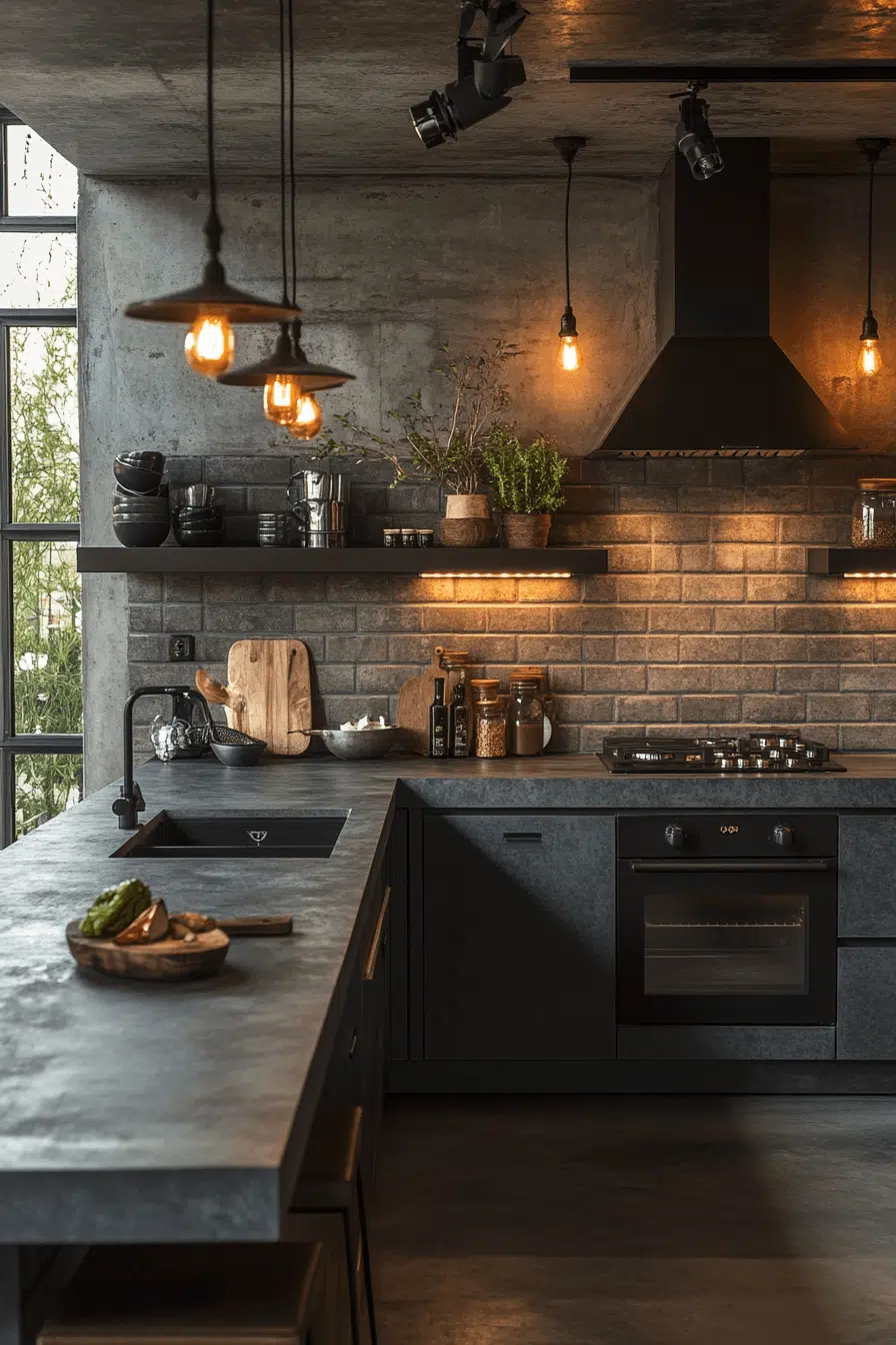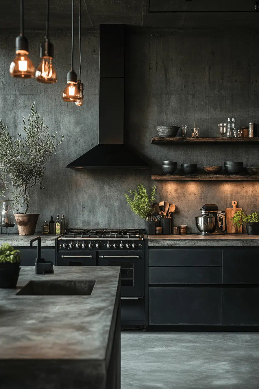 Industrial textures create bold character in a dark grey kitchen filled with contrast and personality. Concrete floors and steel shelving introduce raw, urban appeal. Dark cabinetry anchors the design with strength. Statement lighting enhances the industrial vibe. Warm metallic accents keep the space inviting. Bring industrial edge into your dark grey kitchen effortlessly!