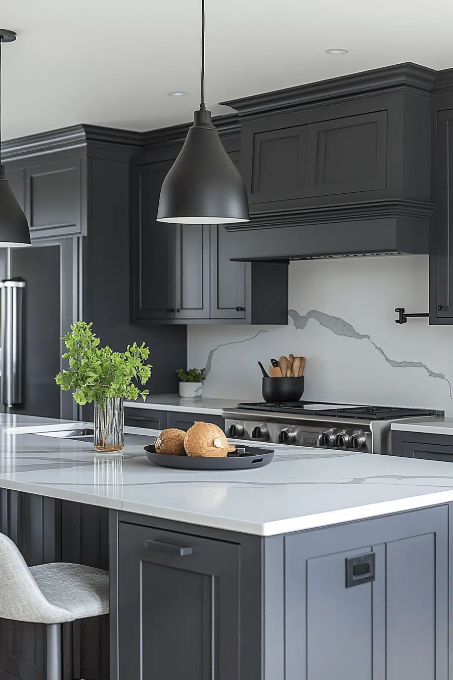Deep charcoal cabinets bring confident structure and bold style into a dark grey kitchen without overwhelming the space. The rich color grounds the design while allowing lighter countertops or statement backsplashes to shine. Minimal hardware and clean lines enhance the sleek appearance. Flat-panel doors keep everything modern and uncluttered. The result feels strong, balanced, and effortlessly stylish. Explore the power of charcoal cabinetry in your dark grey kitchen today!
