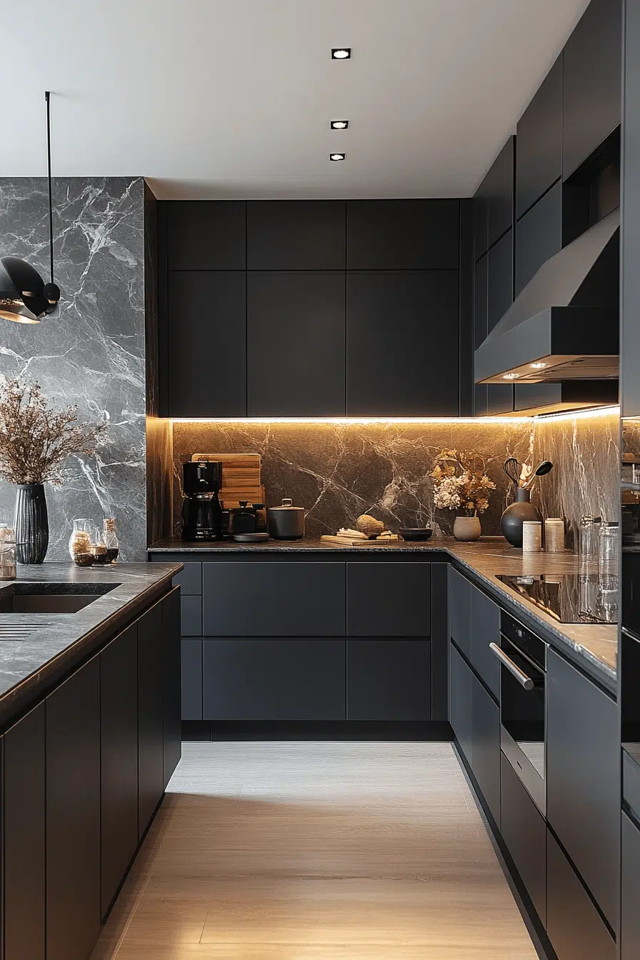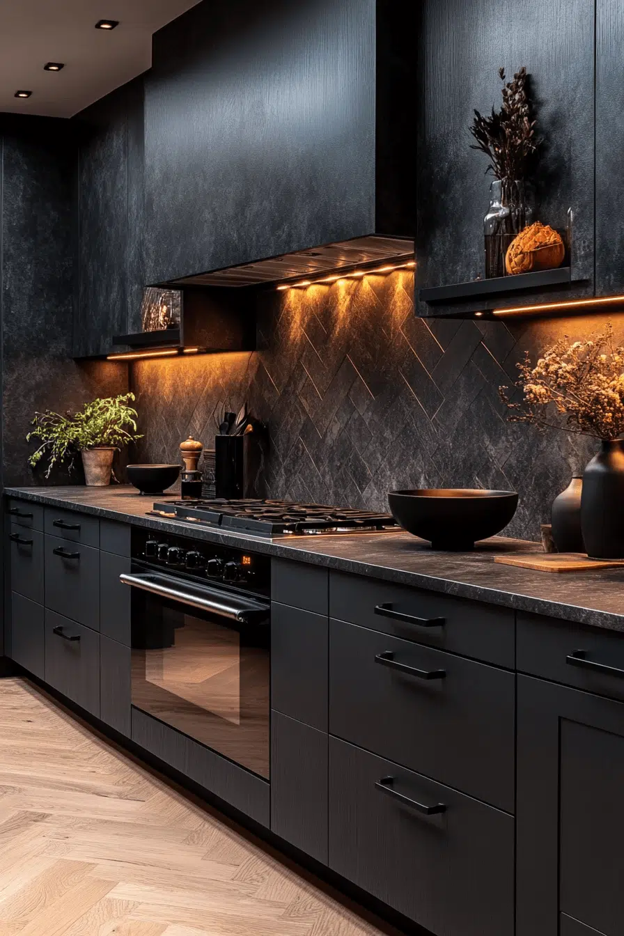 A smooth matte finish instantly upgrades a dark grey kitchen with a rich, modern feel that looks both refined and practical. The velvety surface deepens the tone of the cabinetry while cleverly hiding everyday smudges. Paired with sleek black hardware and integrated appliances, the overall design feels seamless and elevated. Under-cabinet lighting or open shelving introduces brightness and balance. The finish softly diffuses light, creating a cozy yet contemporary atmosphere. Discover how matte finishes can completely redefine your dark grey kitchen!