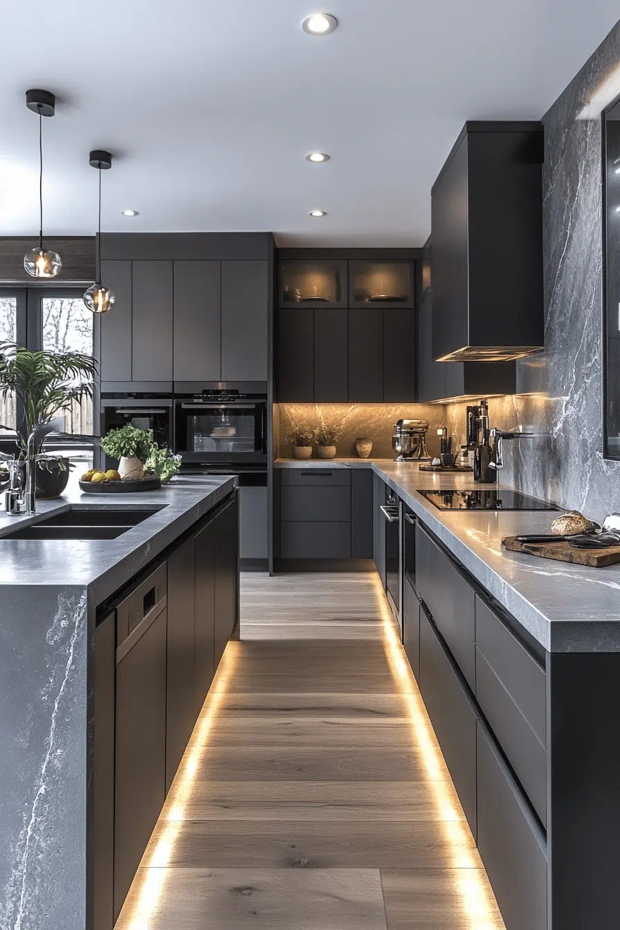 Bold styling transforms a dark grey kitchen into a dramatic focal point filled with energy. Deep tones combined with oversized lighting fixtures create instant impact. Statement surfaces and sleek appliances enhance the modern aesthetic. Light flooring or wood elements balance the palette beautifully. The space feels confident and unforgettable. Make your dark grey kitchen a bold design centerpiece today!