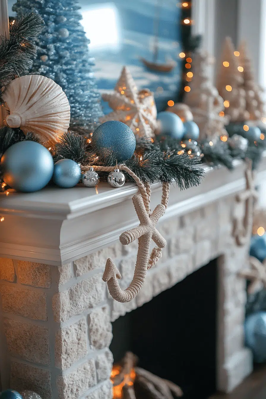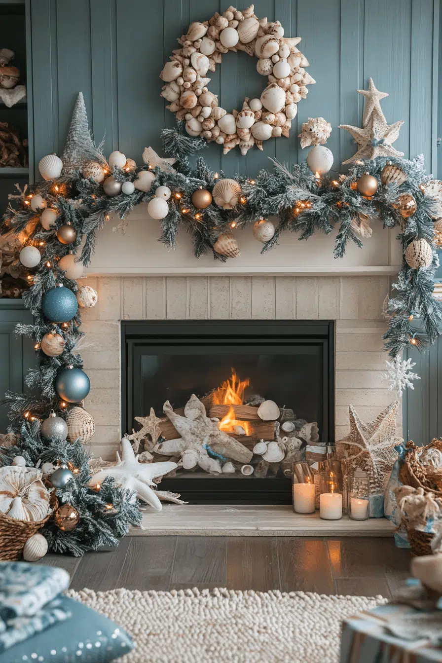 Coastal inspiration fills your mantle with fireplace Christmas decorations drawn from seaside style. Driftwood, seashell details, and ocean-blue accents turn the fireplace into a breezy holiday retreat. The colors evoke calm and add a unique twist to traditional décor. This design is perfect for relaxed celebrations full of charm and lightness.