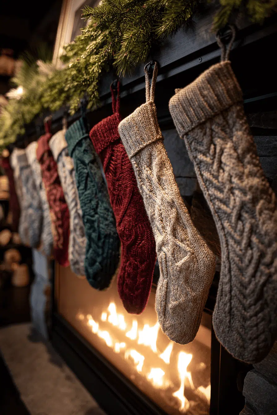 Cozy texture takes center stage with fireplace Christmas decorations using chunky knit stockings. Soft fabrics, plush accessories, and warm hues make the hearth feel wonderfully snug. Layered textures add depth and create an inviting winter ambiance. Every detail encourages comfort and slow seasonal moments.