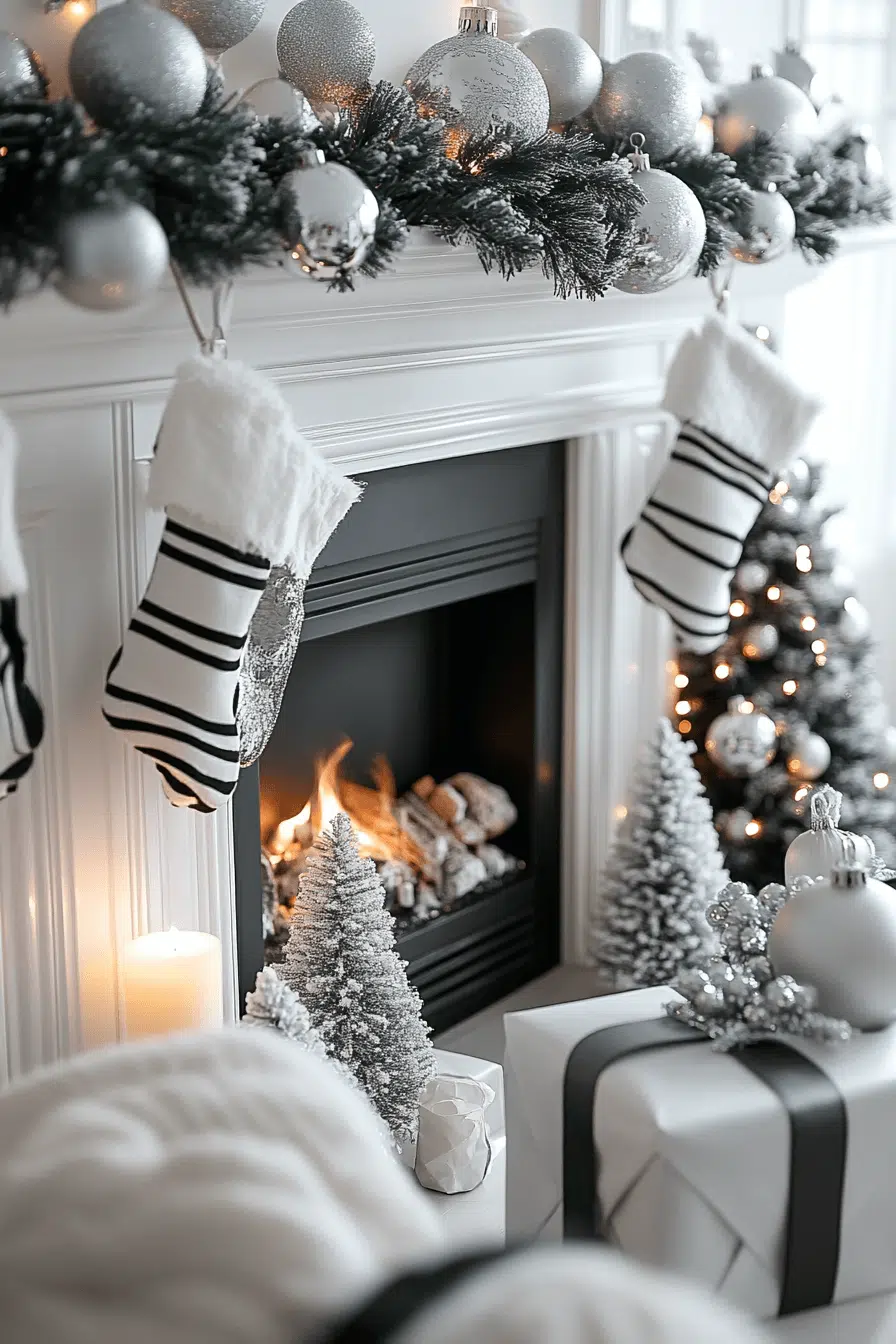 Striking contrast shines with fireplace Christmas decorations in black and white. Bold silhouettes and crisp lines bring modern drama to the fireplace without losing holiday charm. Metallic accents add sparkle that pairs perfectly with the monochrome palette. The style feels fashionable, expressive, and full of holiday personality.