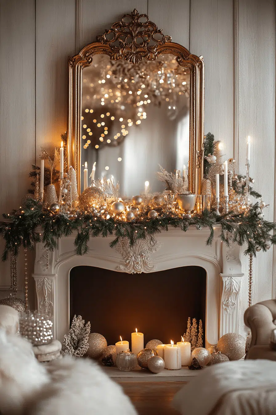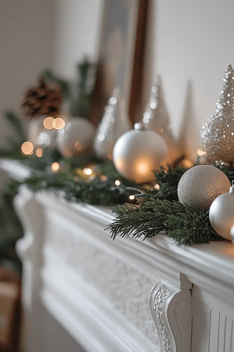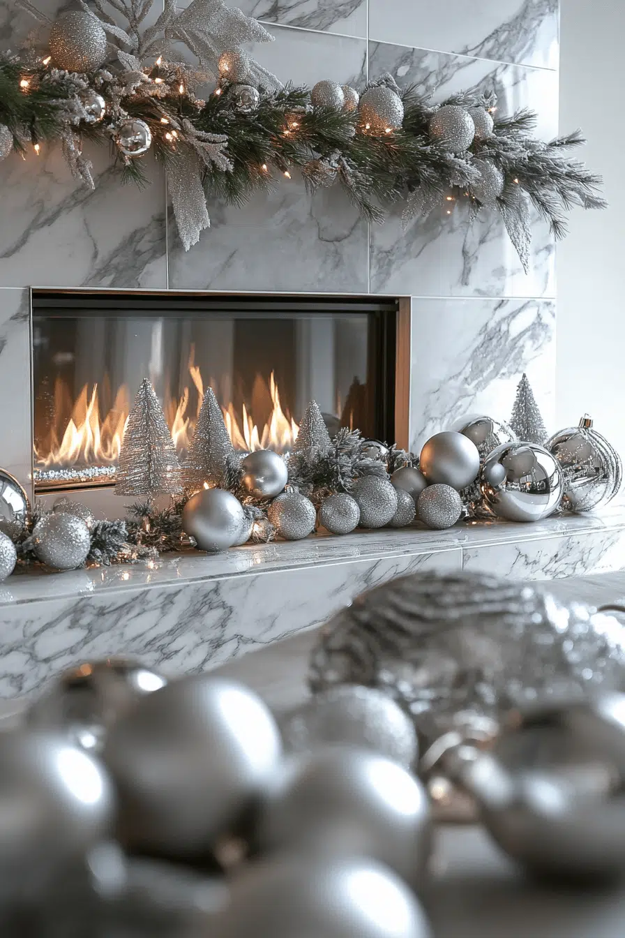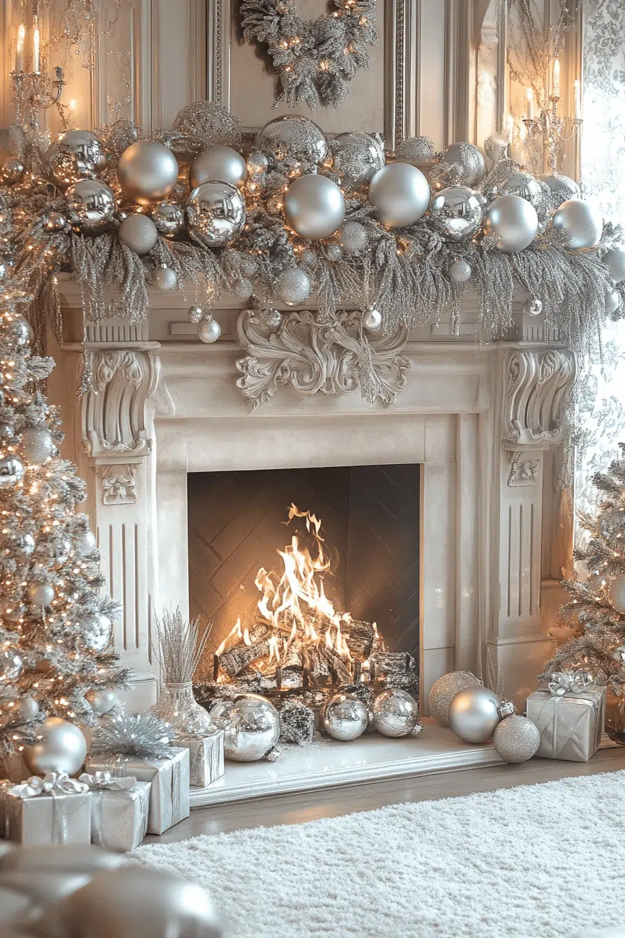 Silver elegance sparkles across your mantle with fireplace Christmas decorations coated in shimmering shine. Reflective ornaments, metallic garlands, and candlelit accents create a cool, glistening glow. The sleek palette feels festive without becoming overwhelming. Every piece adds winter beauty to your space.