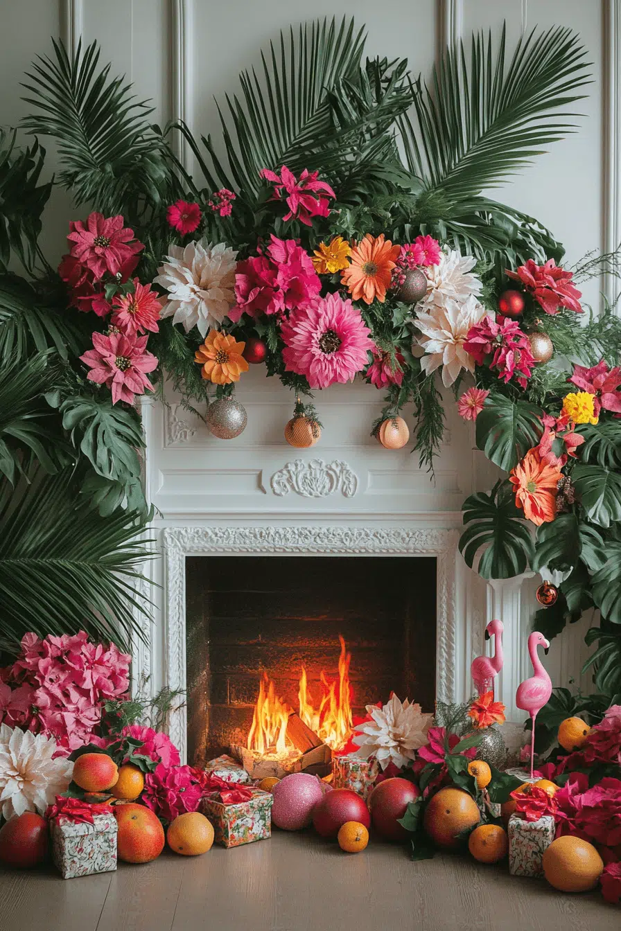 Tropical flair arrives indoors with fireplace Christmas decorations featuring bright florals and island-inspired accents. Cheerful colors refresh your holiday palette while maintaining a lively, sunshine-filled tone. Layered greenery and warm lights balance tropical vibrance with cozy seasonal charm. It’s a joyful alternative perfect for dreamers of warm weather.