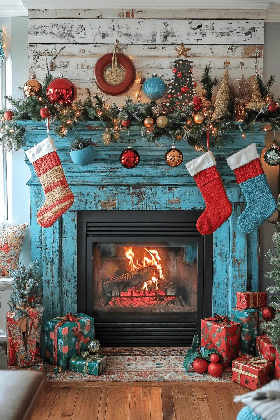 Vibrant holiday color takes over with fireplace Christmas decorations that celebrate bold, expressive hues. Rich ornaments, playful stockings, and eye-catching garlands infuse the mantle with joyful energy. The lively mix brightens the whole room and encourages festive gatherings. Nothing feels ordinary with such spirited style.