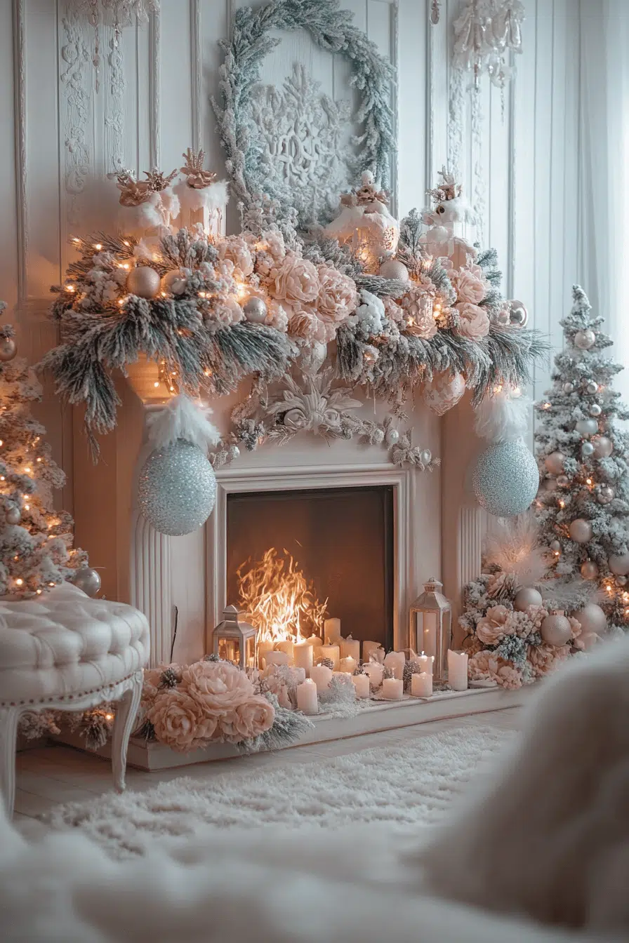 Soft beauty blooms with fireplace Christmas decorations in dreamy pastel shades. Gentle pinks, airy blues, and creamy whites create a soothing holiday palette full of enchantment. Silvery details add delicate sparkle that enhances the magic. Every piece contributes to a peaceful winter atmosphere.