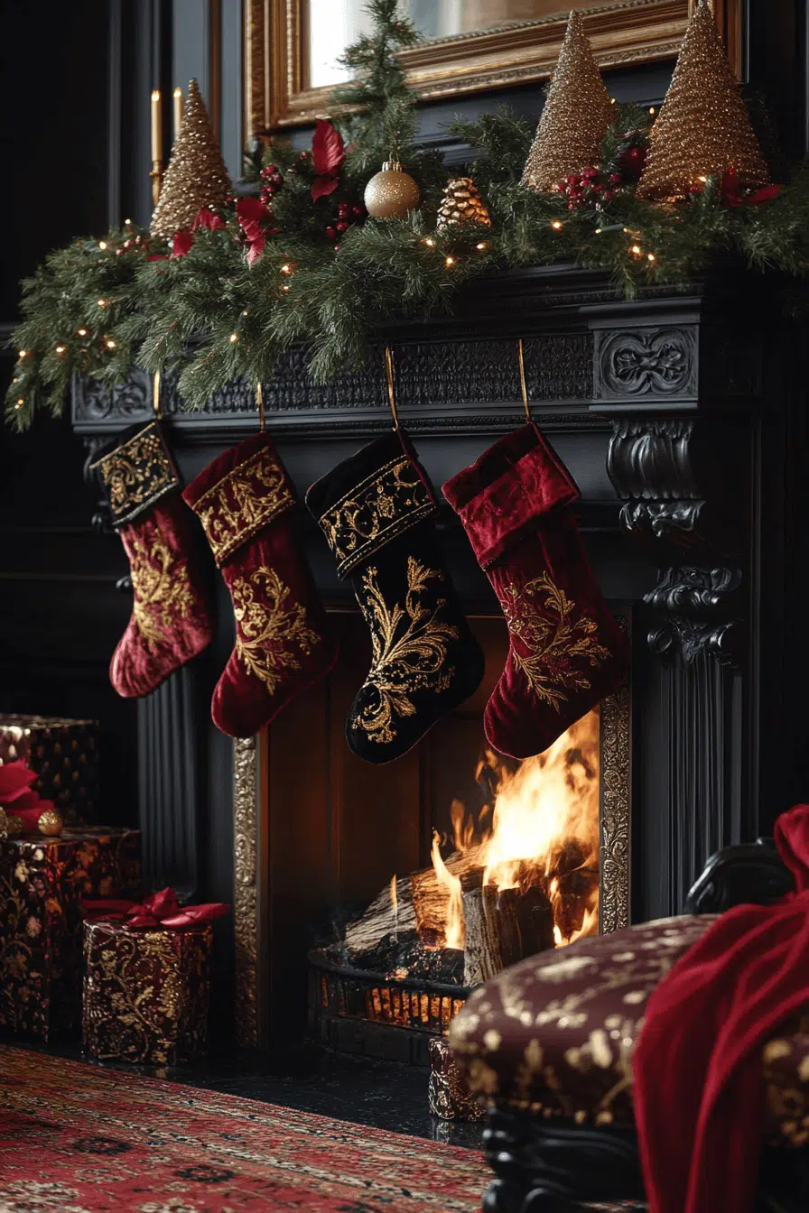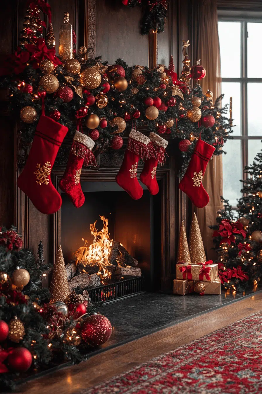Velvet richness elevates your mantle through fireplace Christmas decorations featuring plush textures and deep colors. Jewel-toned ribbons and soft stockings make every detail feel indulgent. Warm lighting brings out the luxurious depth of each material. The final effect marries coziness with polished holiday elegance.