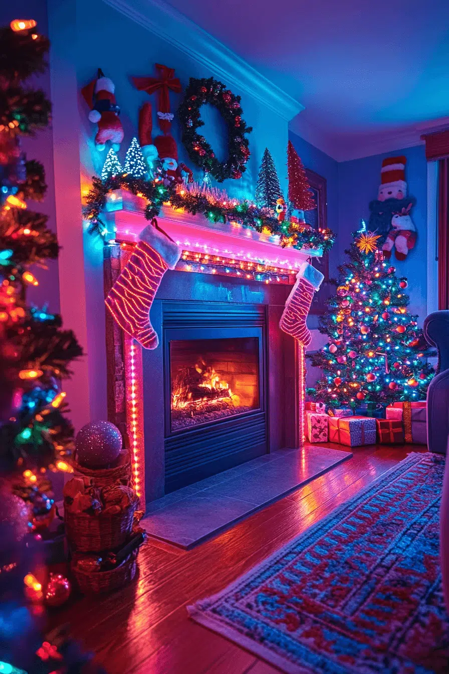 Modern edge comes alive with fireplace Christmas decorations influenced by neon accents. Bright illuminated signs or glowing ornaments inject fun, youthful energy into the scene. Bold color creates exciting contrast that stands out beautifully against classic garlands. This look feels artistic, daring, and completely fresh.