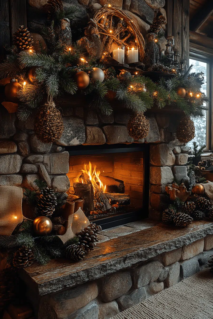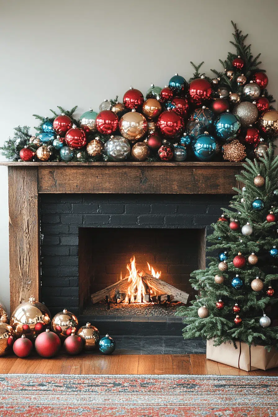 Modern elegance meets holiday cheer with fireplace Christmas decorations that shine in metallic finishes. Gold, silver, and copper ornaments play beautifully with the natural firelight, adding refined depth and sparkle. Clean lines and polished surfaces turn the mantle into a bold contemporary statement. The look stays festive while feeling fresh and sophisticated.