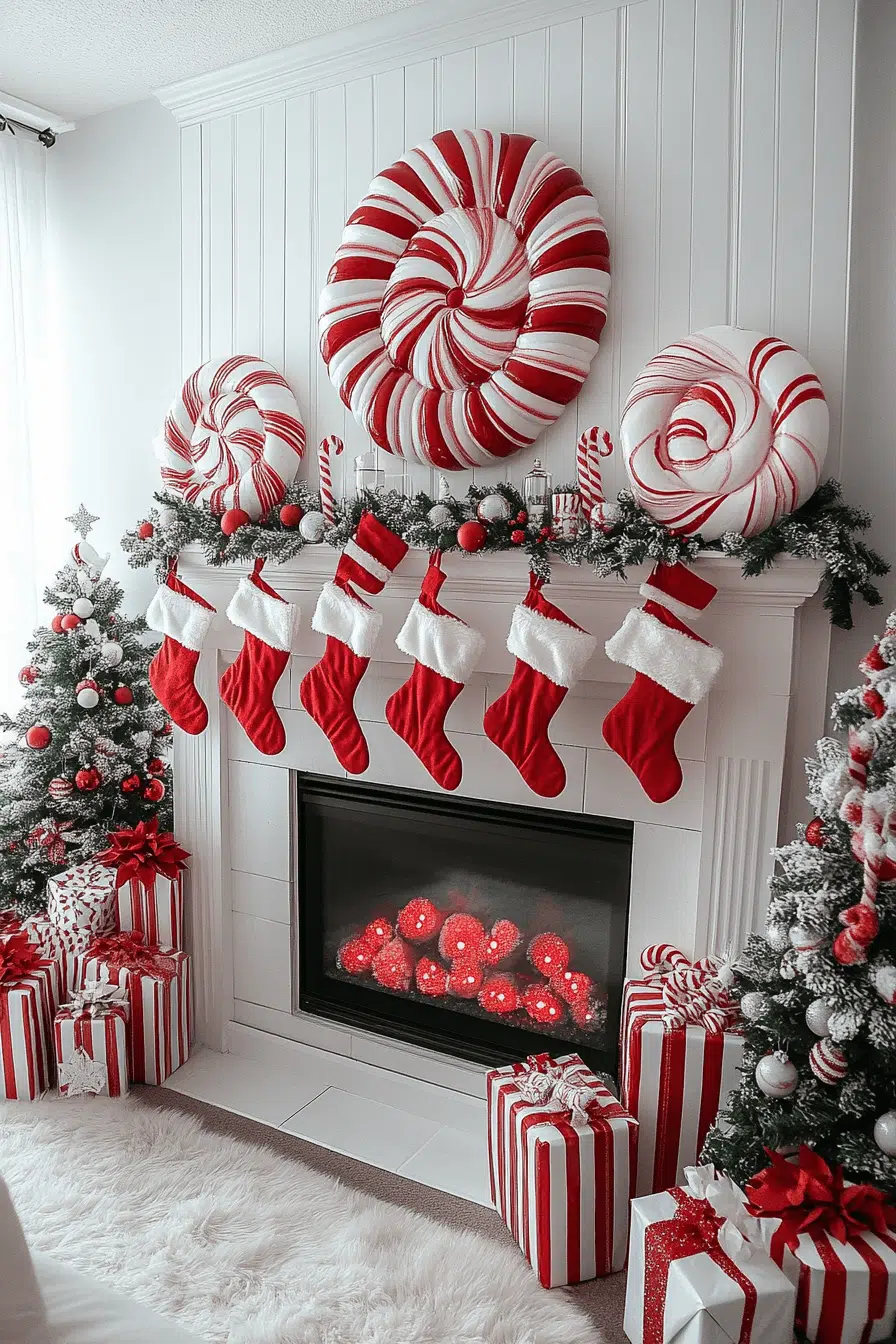 Sweet nostalgia arrives with fireplace Christmas decorations inspired by peppermint stripes and candy cane charm. Red-and-white patterns bring cheerful whimsy that feels instantly festive. Paired with greenery, the look feels both fresh and classic. Kids and adults alike adore the playful personality.