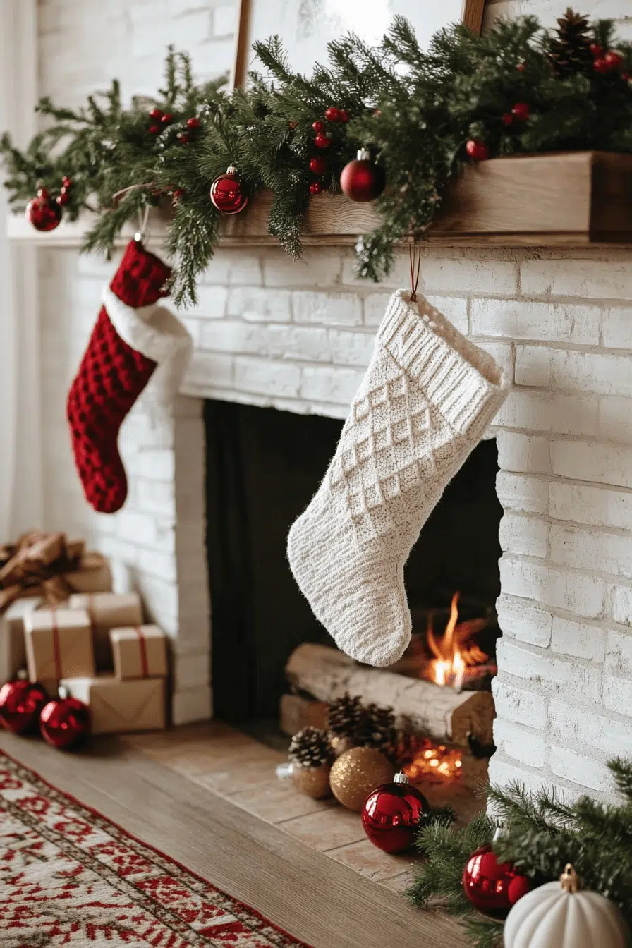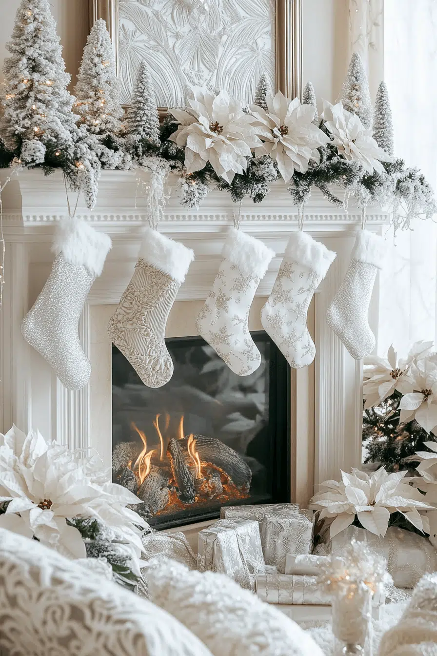 White holiday elegance comes alive with fireplace Christmas decorations that embrace cool tones and soft winter textures. Shimmering silver ornaments and crisp white stockings form a dreamy scene that feels clean and calming. The monochrome palette adds sophistication without overwhelming the space. Every detail helps create a soothing holiday sanctuary.