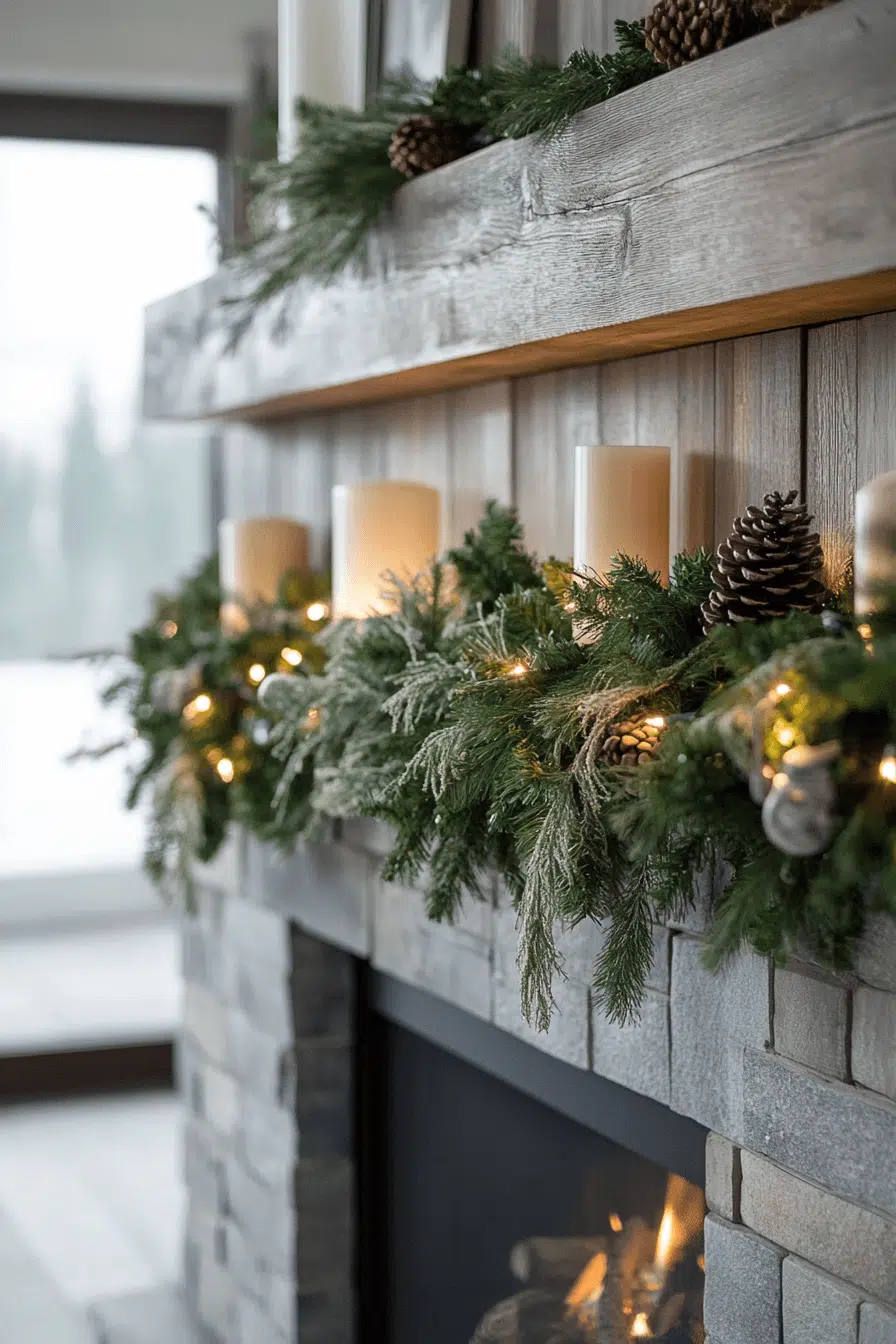 Organic beauty enhances your home with fireplace Christmas decorations featuring lush greenery garlands. Pine and cedar strands bring refreshing natural texture that instantly warms the room. Gentle lighting woven through the greenery adds soft seasonal glow. The overall feel lands between timeless and effortlessly elegant.