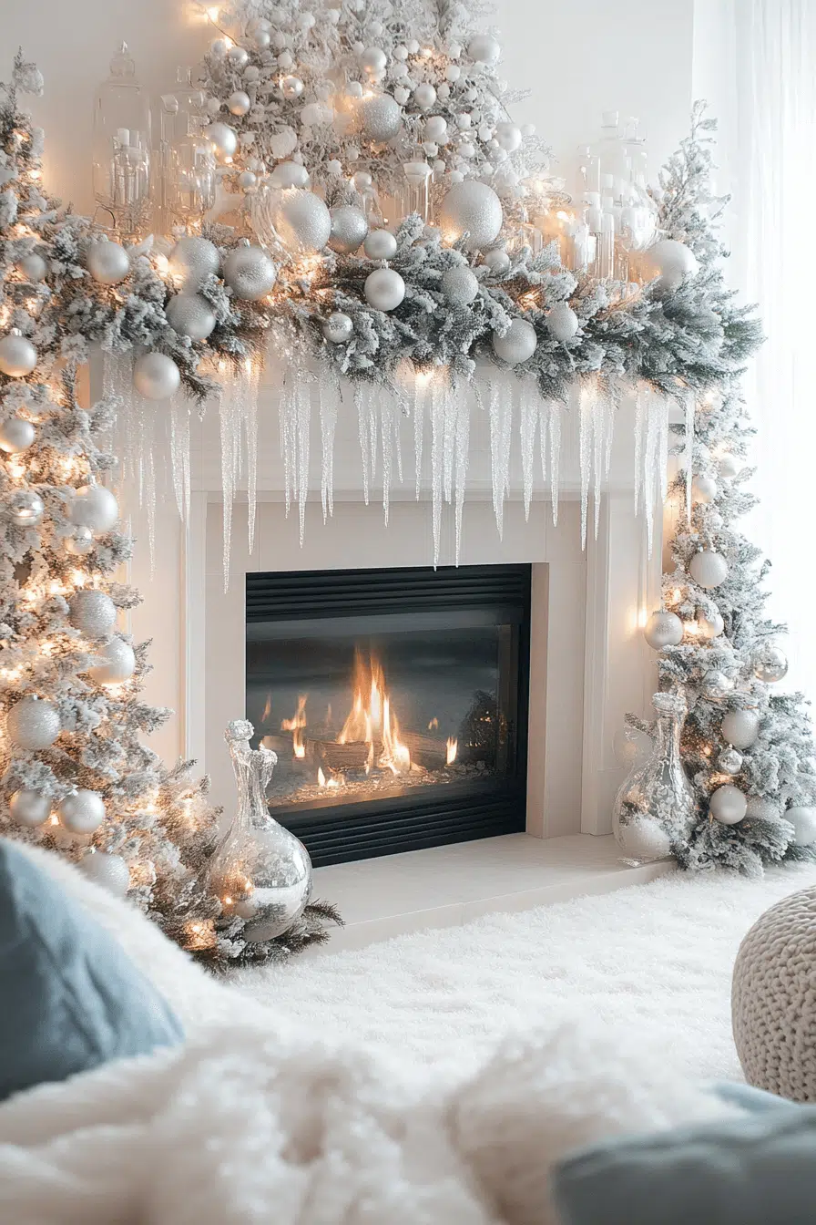 White holiday elegance comes alive with fireplace Christmas decorations that embrace cool tones and soft winter textures. Shimmering silver ornaments and crisp white stockings form a dreamy scene that feels clean and calming. The monochrome palette adds sophistication without overwhelming the space. Every detail helps create a soothing holiday sanctuary.