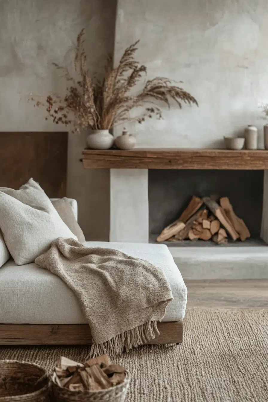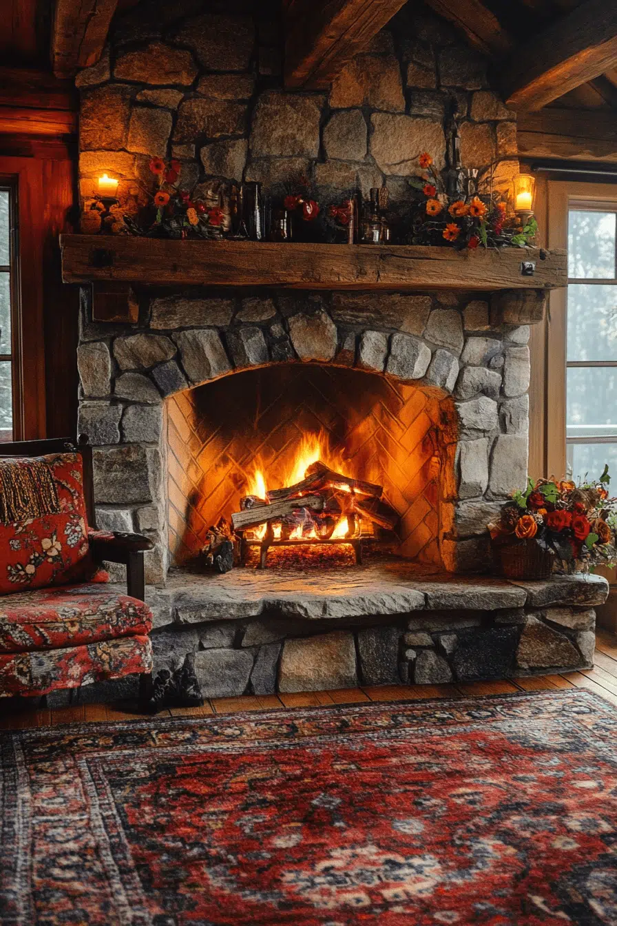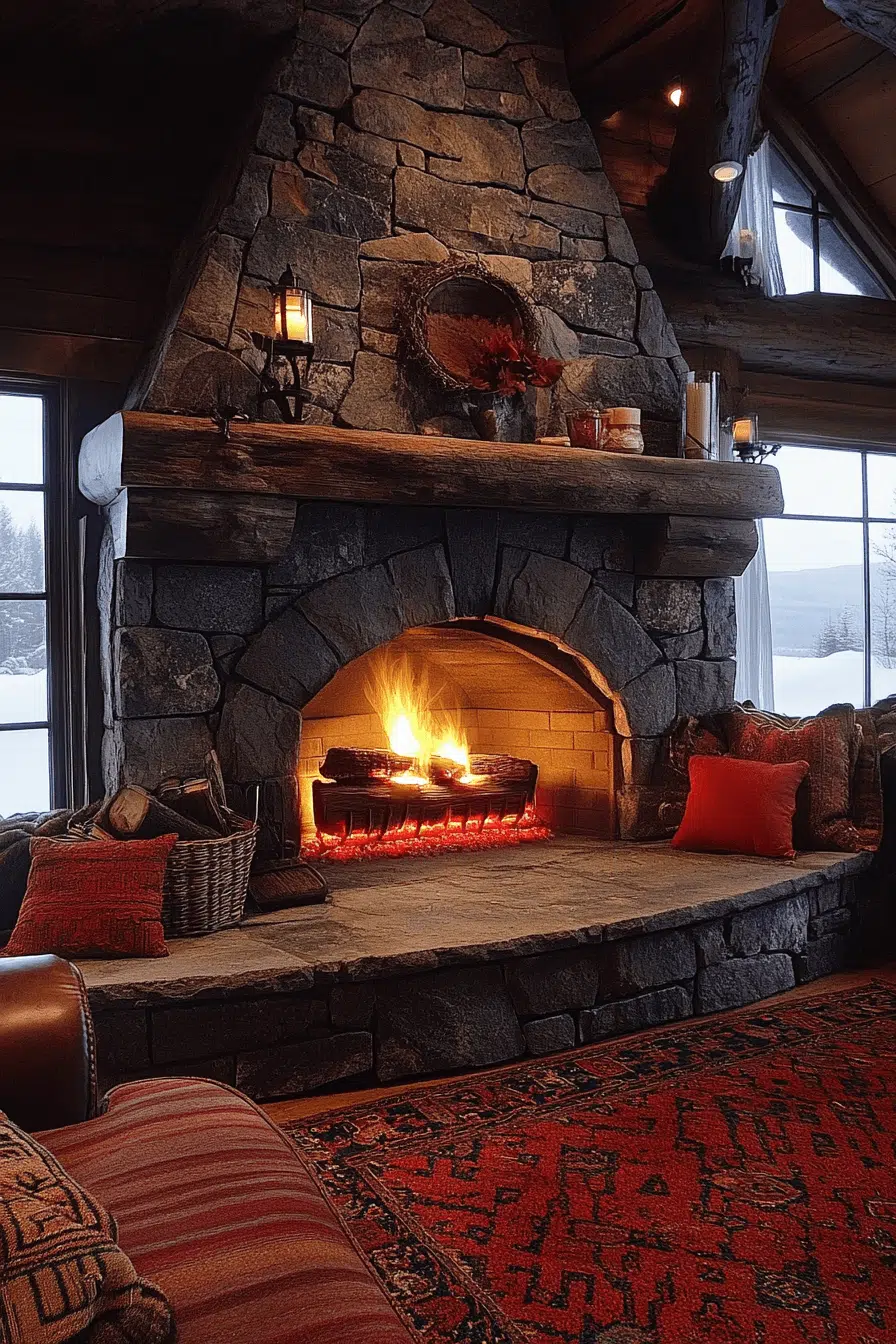 Raw stone fireplaces bring a sense of grounded beauty that feels warm and organic. Uneven textures and natural tones create a striking focal point full of character. This design pairs beautifully with wood accents and layered textiles. It’s an ideal fit for homes that embrace comfort and nature-inspired design. Among rustic fireplace interior ideas, stone offers unmatched authenticity.