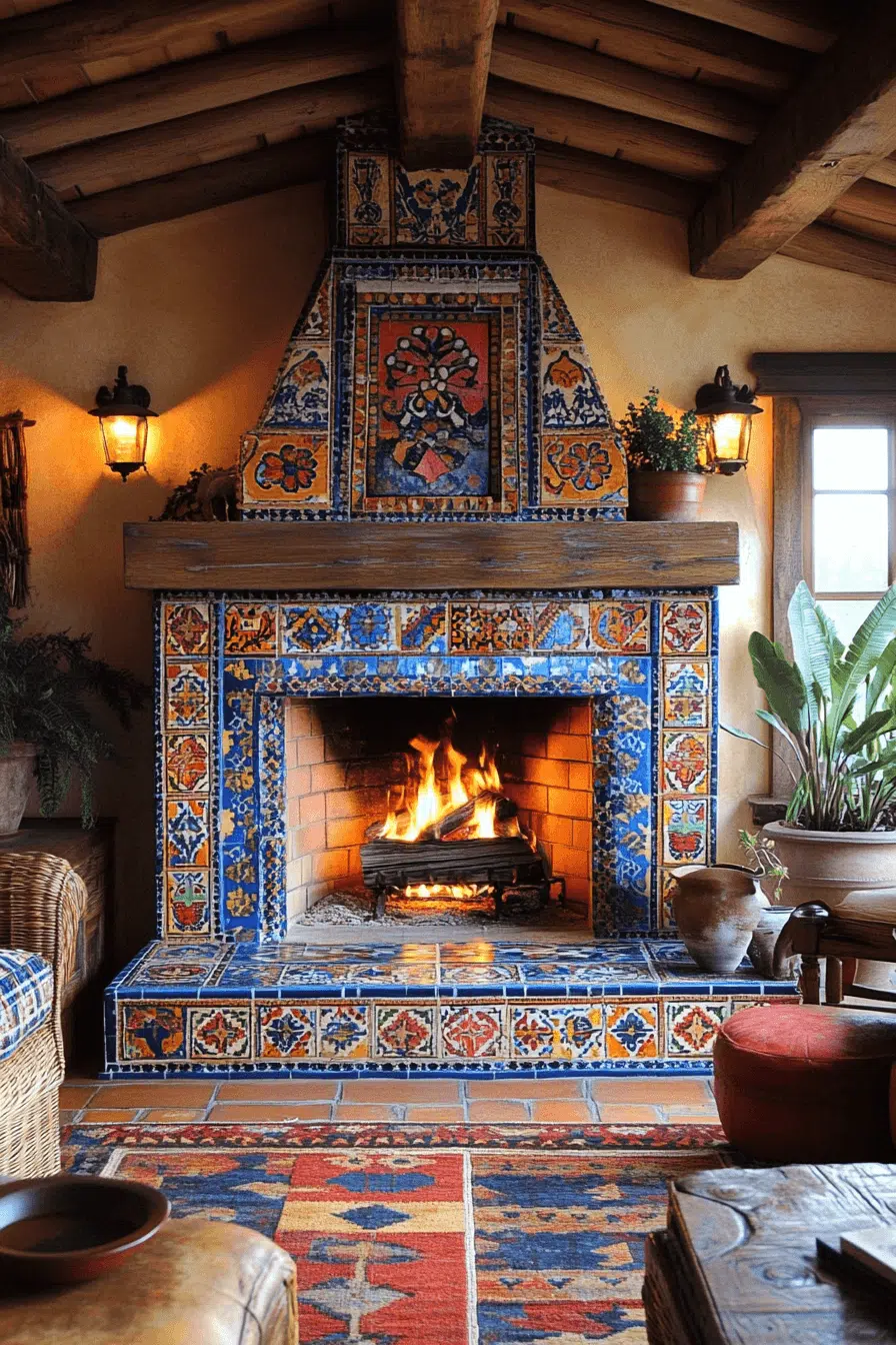 Mediterranean tile fireplaces burst with color, pattern, and artistic energy. Handcrafted tiles transform the fireplace into a visual masterpiece. Neutral furnishings allow the vibrant design to shine without overwhelm. This joyful approach stands out among expressive fireplace interior ideas. The result feels lively, warm, and full of personality.