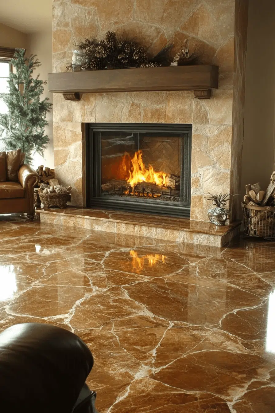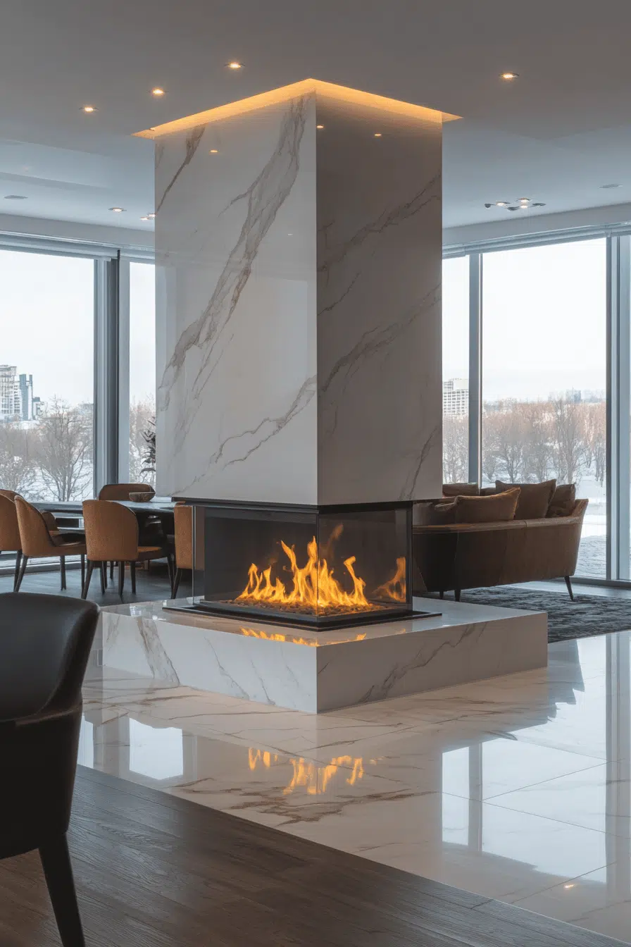 Polished marble transforms a fireplace into a refined centerpiece with effortless elegance. Its luminous surface reflects light beautifully, brightening the entire room. Natural veining ensures each installation feels custom and artful. This luxurious option stands out among fireplace interior ideas for its balance of drama and sophistication. Marble pairs seamlessly with both modern and classic interiors.