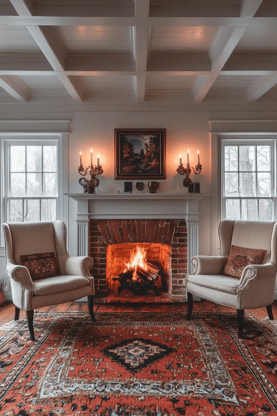 Colonial fireplaces offer symmetry, warmth, and historical charm. Structured surrounds and classic mantels bring order and familiarity. Decorative accents enhance the heritage feel without excess. This style fits beautifully in both formal and relaxed spaces. Among traditional fireplace interior ideas, colonial designs remain timeless.
