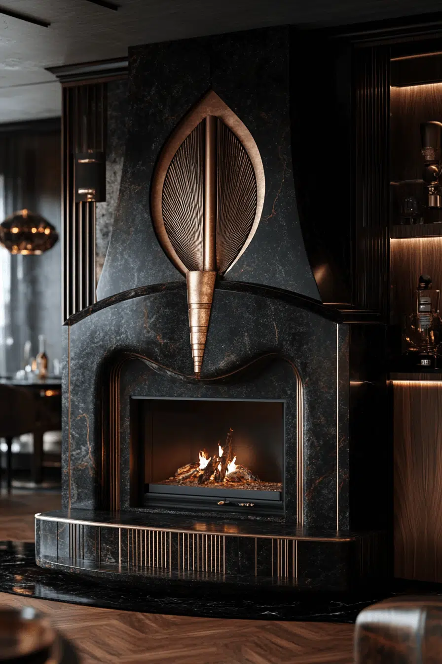 Art deco fireplaces introduce glamour through bold geometry and contrast. Luxurious materials like marble and metal create a striking visual impact. Clean symmetry keeps the look polished and refined. These fireplaces become sculptural focal points. Among glamorous fireplace interior ideas, art deco designs stand out effortlessly.