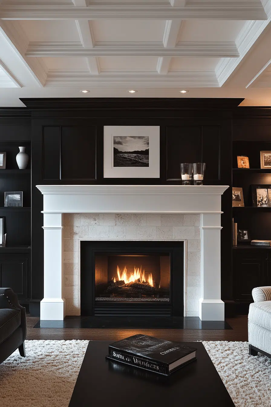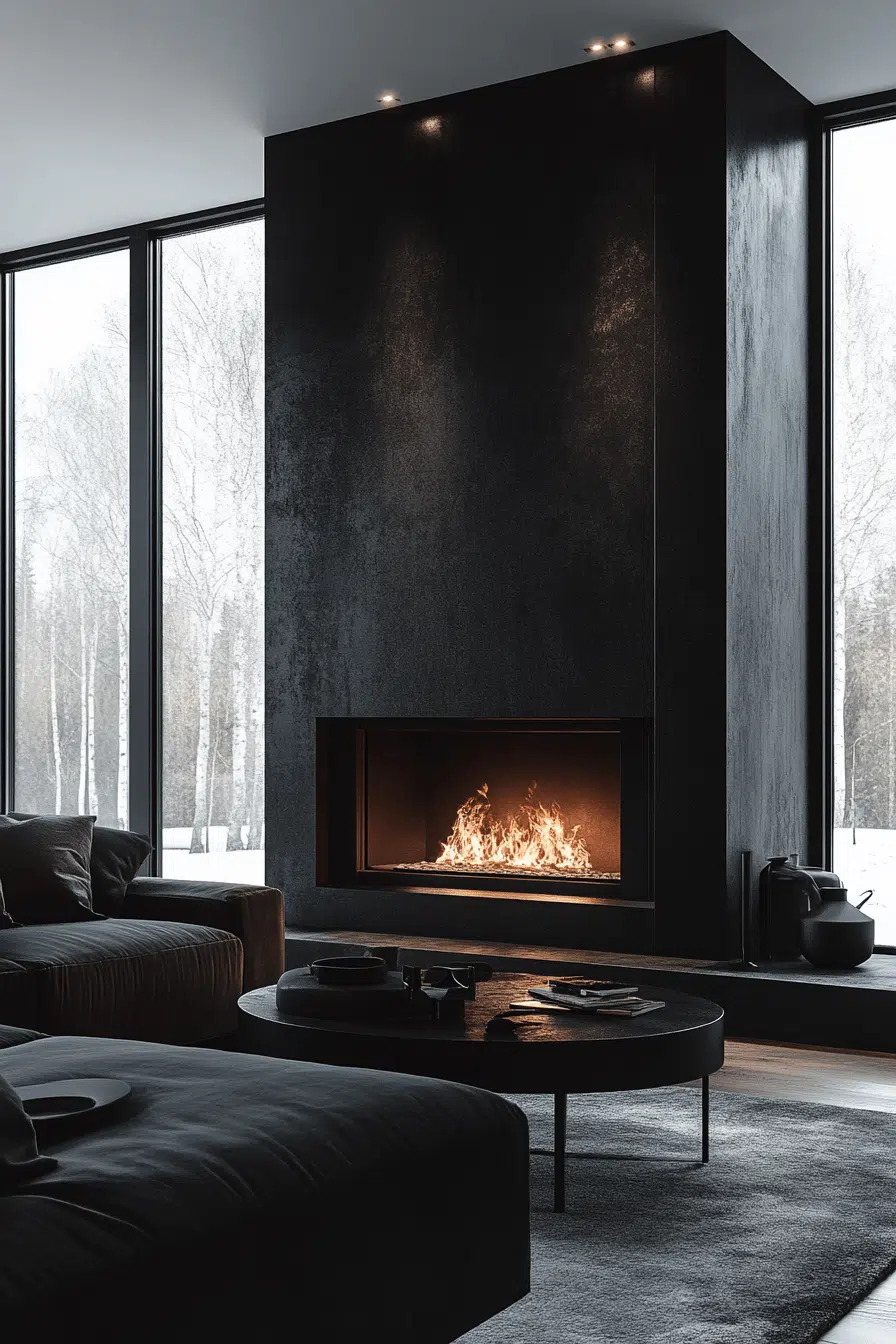 Black fireplaces add striking contrast and modern confidence. Matte or glossy finishes highlight architectural lines beautifully. This bold choice anchors the room with sophistication. Black pairs easily with layered textures and neutral palettes. Among dramatic fireplace interior ideas, this look feels timeless and bold.