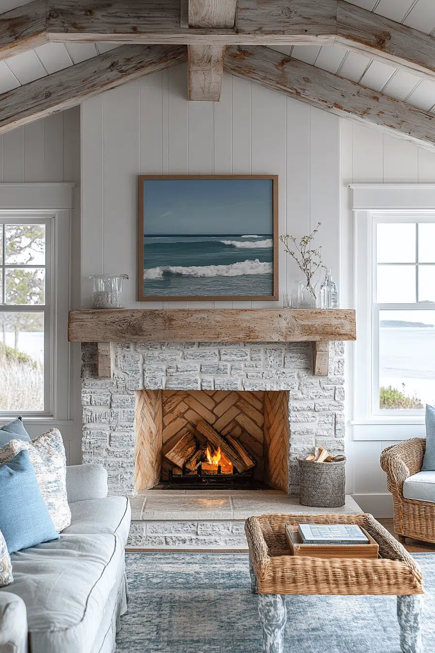 Coastal fireplaces bring relaxed energy with light finishes and breezy textures. Natural materials enhance the airy atmosphere. The design feels calm, casual, and inviting. These fireplaces complement open layouts beautifully. Among laid-back fireplace interior ideas, coastal styles bring everyday serenity.