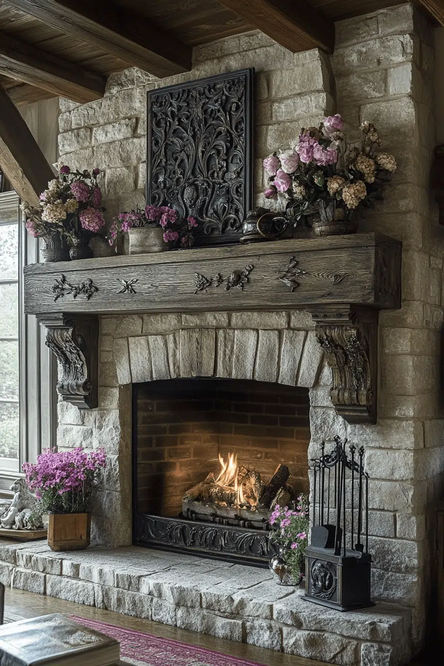 French country fireplaces blend elegance with rustic romance. Soft curves and aged finishes evoke countryside charm. Stone surrounds and antique details enhance warmth and character. This timeless style feels layered and inviting. Among graceful fireplace interior ideas, French country designs feel effortlessly refined.