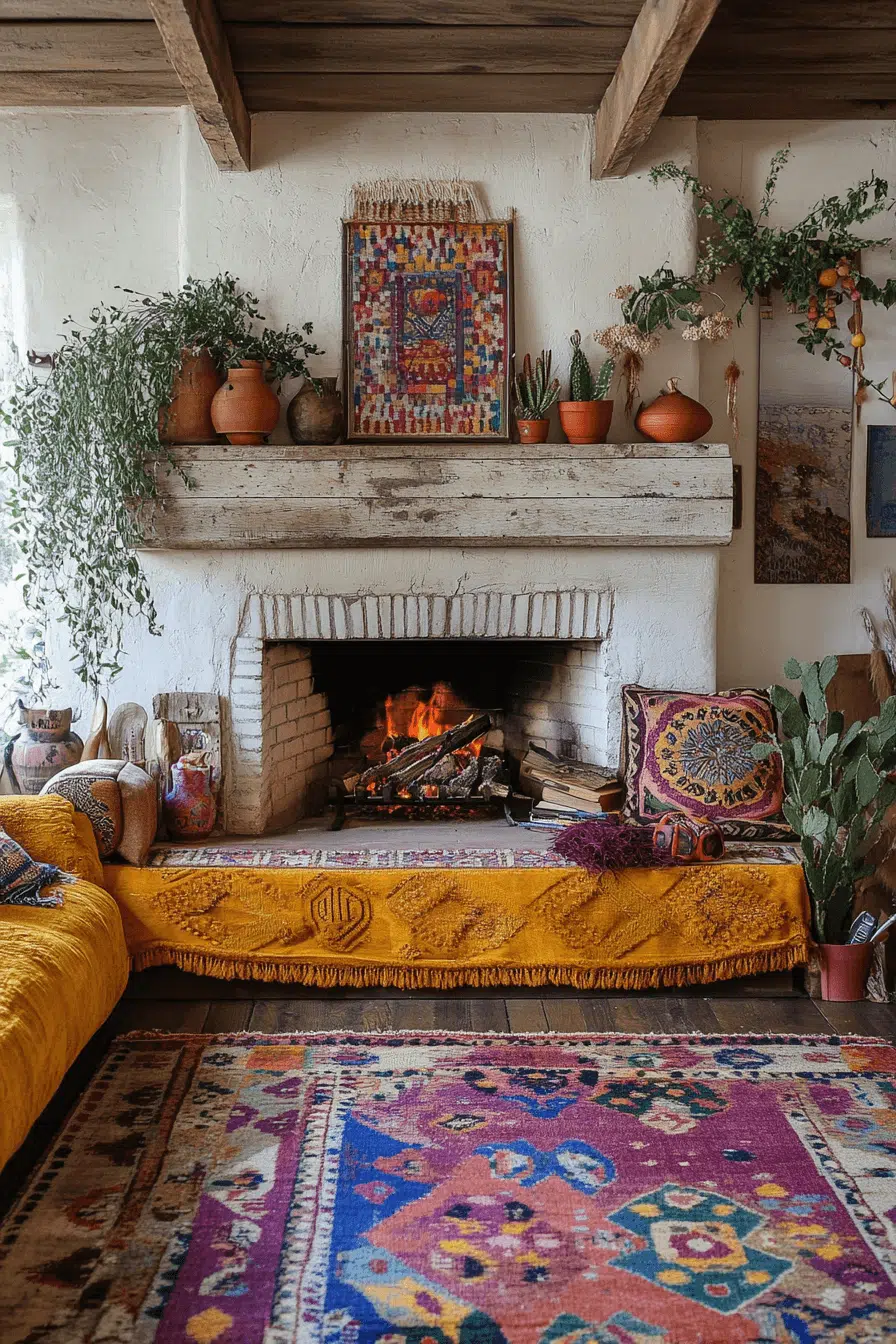 Bohemian fireplaces embrace creativity with layered textures and global accents. Colorful tiles and eclectic décor turn the hearth into a personal expression. This relaxed style celebrates individuality and warmth. Among artistic fireplace interior ideas, boho designs feel free-spirited and cozy.