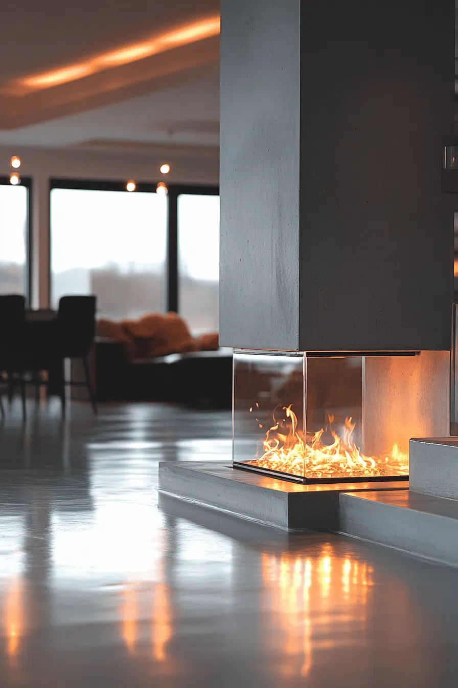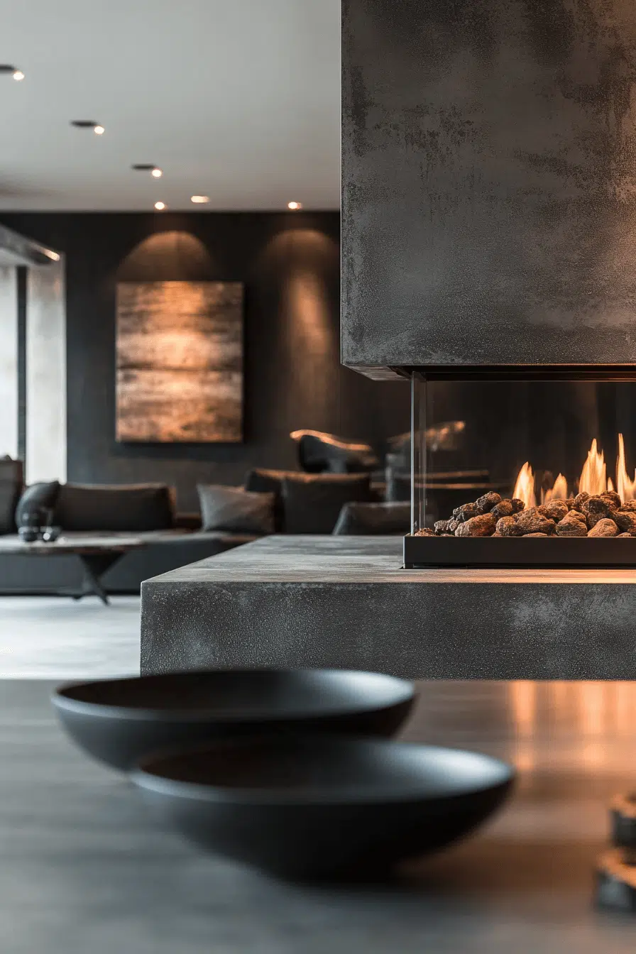 Concrete fireplaces introduce industrial elegance with modern restraint. Smooth surfaces and cool tones create a sculptural focal point. This style works especially well in open-concept or loft spaces. Despite its edge, it still radiates warmth. Among contemporary fireplace interior ideas, concrete feels refined and bold.