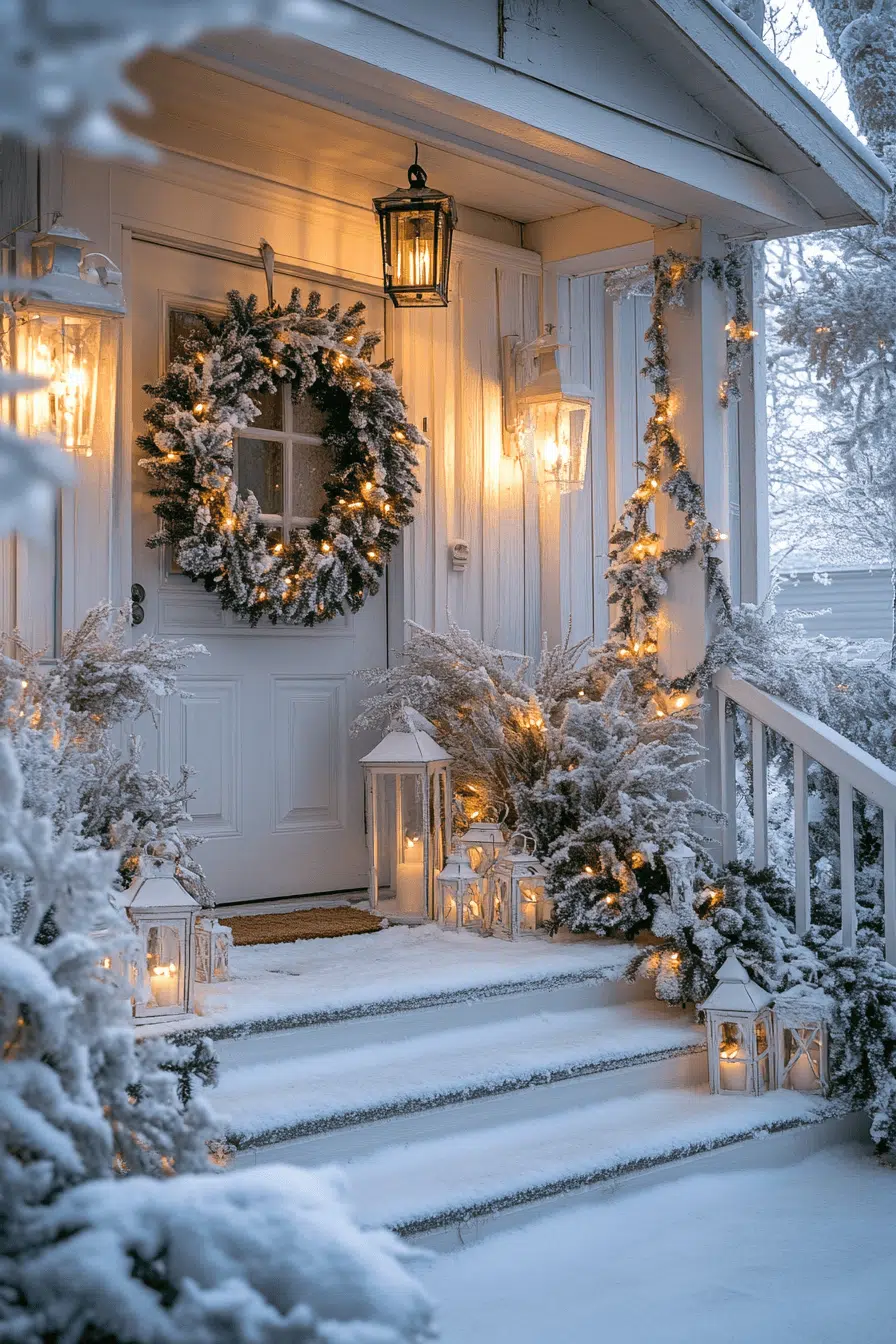 Design a peaceful holiday escape with front porch Christmas decor inspired by snow-dusted mornings. Frosted pine garlands, shimmering ribbons, and white wreaths create a quiet elegance. Add soft lights to mimic falling snowflakes. The look is tranquil, delicate, and dreamlike.