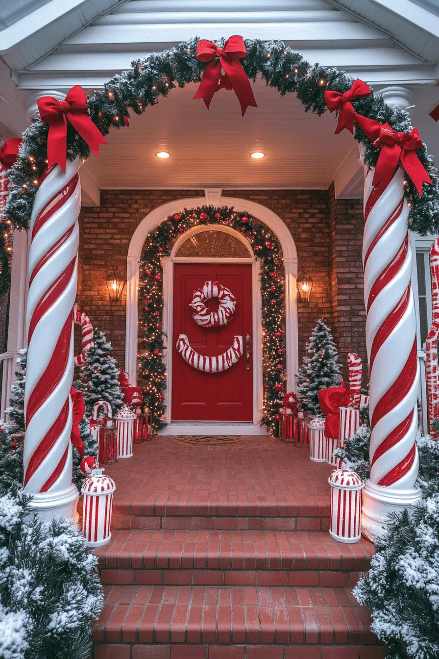 Delight your guests with a candy-striped front porch Christmas decor theme full of playful energy. Red and white ribbons twist through garlands, while peppermint ornaments dangle from frosted branches. The palette feels cheerful and bright without being overwhelming. It’s sugar-sweet nostalgia brought to life.