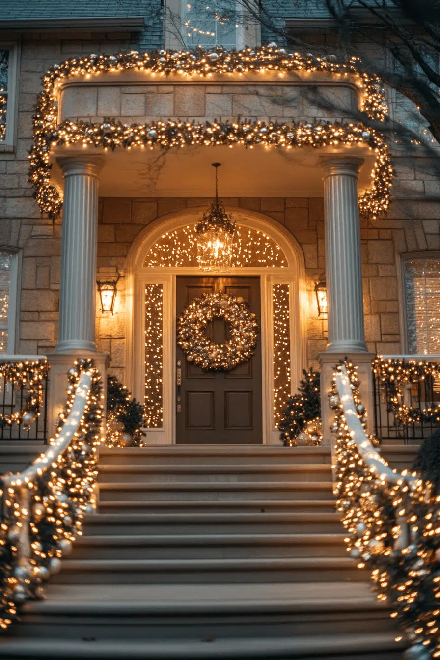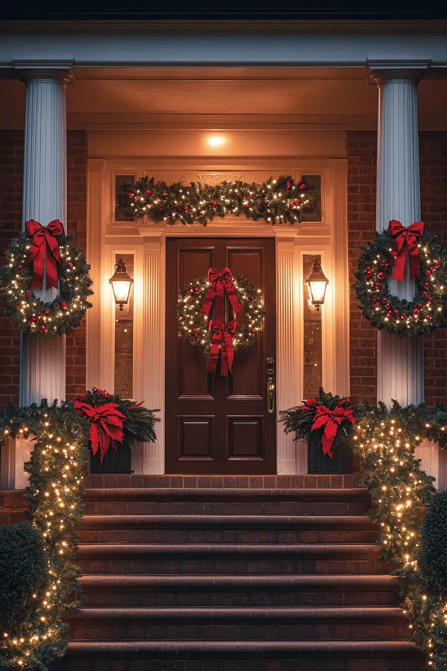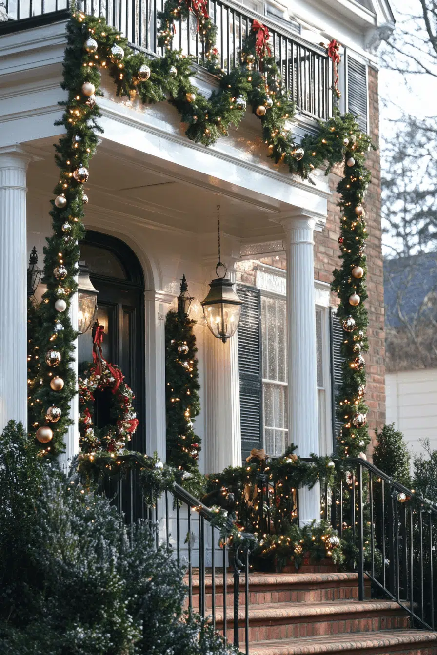 Add sophistication to your steps with front porch Christmas decor that cascades elegantly down the rails. Ribbon-trimmed garlands and soft lighting draw the eye toward the doorway. It’s the perfect blend of structure and sparkle.